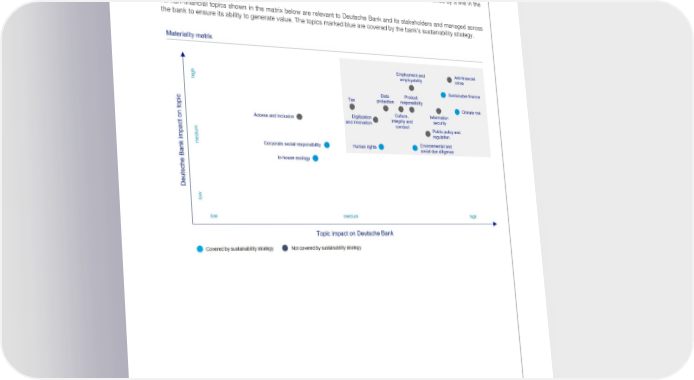 Deutsche Bank Introduction Non-Financial Report 2022 Materiality assessment Material non-financial topics 2022 GRI 3-1/2 The results of the materiality assessment are shown in the matrix below. The topics in the top right grey area of the matrix meet the materiality requirements of Section 315c in conjunction with Section 289c (3) HGB and form Deutsche Bank’s “Non- Financial Statement”. Throughout the report, each material topic of the “Non-Financial Statement” is marked by a line in the margin. All non-financial topics shown in the matrix below are relevant to Deutsche Bank and its stakeholders and managed across the bank to ensure its ability to generate value. The topics marked blue are covered by the bank’s sustainability strategy. 10