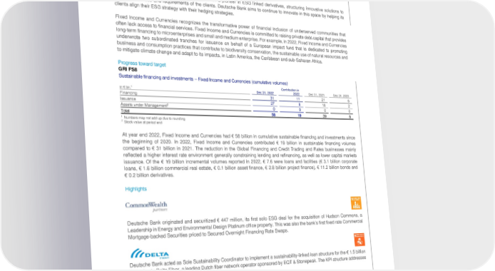 Deutsche Bank Transition toward a sustainable and climate-neutral economy Non-Financial Report 2022 Sustainable finance The Global Emerging Markets business has a strong market leadership and footprint in developing novel ESG solutions by structuring and executing innovative and award winning ESG-linked financing and risk management solutions for its global client base. In addition, Global Emerging Markets provides primary and secondary trading for green and social bonds issued by supranational institutions in emerging market currencies which amounted to around € 3 billion through seven issuances in 2022. Overall, Global Emerging Markets franchise contributed € 0.9 billion towards bank’s sustainable financing and investments volumes target for 2022. The Global Foreign Exchange business has been a pioneer in ESG linked derivatives, structuring innovative solutions to answer the needs and requirements of the clients. Deutsche Bank aims to continue to innovate in this space by helping its clients align their ESG strategy with their hedging strategies. Fixed Income and Currencies recognizes the transformative power of financial inclusion of underserved communities that often lack access to financial services. Fixed Income and Currencies is committed to raising private debt capital that provides long-term financing to microenterprises and small and medium enterprise. For example, in 2022, Fixed Income and Currencies underwrote two subordinated tranches for issuance on behalf of a European impact fund that is dedicated to promoting business and consumption practices that contribute to biodiversity conservation, the sustainable use of natural resources and to mitigate climate change and adapt to its impacts, in Latin America, the Caribbean and sub-Saharan Africa. Progress toward target GRI FS8 Sustainable financing and investments – Fixed Income and Currencies (cumulative volumes) Contribution in 1 in € bn. Dec 31, 2022 2022 Dec 31, 2021 Dec 31, 2020 Financing 31 11 21 6 Issuance 27 8 18 2 2 Assets under Management 0 0 0 0 Total 58 19 39 8 1 Numbers may not add up due to rounding 2 Stock value at period end At year end 2022, Fixed Income and Currencies had € 58 billion in cumulative sustainable financing and investments since the beginning of 2020. In 2022, Fixed Income and Currencies contributed € 19 billion in sustainable financing volumes compared to € 31 billion in 2021. The reduction in the Global Financing and Credit Trading and Rates businesses mainly reflected a higher interest rate environment generally constraining lending and refinancing, as well as lower capital markets issuance. Of the € 19 billion incremental volumes reported in 2022, € 7.6 were loans and facilities (€ 3.1 billion corporate loans, € 1.6 billion commercial real estate, € 0.1 billion asset finance, € 2.8 billion project finance), € 11.2 billion bonds and € 0.2 billion derivatives. Highlights Deutsche Bank originated and securitized € 447 million, its first solo ESG deal for the acquisition of Hudson Commons, a Leadership in Energy and Environmental Design Platinum office property. This was also the bank’s first fixed rate Commercial Mortgage-backed Securities priced to Secured Overnight Financing Rate Swaps. Deutsche Bank acted as Sole Sustainability Coordinator to implement a sustainability-linked loan structure for the € 1.5 billion financing to Delta Fiber, a leading Dutch fiber network operator sponsored by EQT & Stonepeak. The KPI structure addresses the most material ESG topics through three KPIs. Deutsche Bank has executed multiple loans worth € 17 million with Dominium that were used to construct 803 affordable multifamily units in Phoenix, Arizona (AZ) and Woodbury, Minnesota (MN) USA. These projects will provide high-quality, safe and affordable housing for families and seniors that earn less than 60% of the area’s median incomes. This transaction encourages more activity in the space as a new source of affordable housing financing that meets unmet demand nationwide. 27