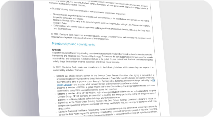 Deutsche Bank Governance and operations Non-Financial Report 2022 Stakeholder engagement and thought leadership In 2022, Deutsche Bank responded to numerous media queries and its communications experts accompanied journalists for interviews or background talks with a number of the bank’s senior managers. Furthermore, Deutsche Bank convened and participated in various conferences and public panels, and offered a range of media events and platforms for further dialogue with its stakeholders. Non-governmental organizations Deutsche Bank engages with stakeholders from broader society to understand their views on global environmental and social trends and challenges. For example, the bank continually engages with non-governmental organizations and participates in numerous sustainability-related initiatives. In 2022 the following were important topics of non-governmental organizations engagement: – Climate change, especially in relation to topics such as the financing of the fossil fuels sector in general, and with regards to specific companies and projects – Respect of human rights, partly in the context of specific sectors and regions, e.g., mining in Latin America or the hospitality sector in Qatar – Deforestation, with a sector focus on agriculture and a regional focus on Brazil/Latin America, Africa (e.g., the Congo Basin) and Southeast Asia In 2022, Deutsche Bank responded to written requests, surveys, or questionnaires, and repeatedly met non-governmental organizations in person to discuss the themes of their engagement. Memberships and commitments GRI 2-28 As part of Deutsche Bank’s long-standing commitment to sustainability, the bank has formally endorsed universal sustainability frameworks and initiatives (see “Sustainability strategy). Furthermore, the bank supports several organizations that promote sustainability, and collaborates in industry initiatives at the global, EU, and national level. The bank contributes its expertise to help shape the transition toward a sustainable and climate-neutral economy. In 2022, Deutsche Bank made new commitments to the following initiatives, which address important aspects of its sustainability activities: The bank: – Became an official network partner for the German Ocean Decade Committee, after signing a memorandum of understanding to actively support the United Nations Decade of Ocean Science and Sustainable Development in Germany: the Partnership aims to promote ocean literacy in Germany, raise awareness of the ten challenges outlined by the UN Ocean Decade (*) and to act as a link between German and international Ocean Decade activities – Became a member of RE100, a global initiative led by the Climate Group, that brings together influential businesses committed to using 100% renewable electricity across their operations – Became a member of the EP100 initiative, a global energy productivity initiative also led by the international non-profit Climate Group. EP100 members are committed to doubling their energy productivity, rolling out energy management systems, or achieving net zero carbon buildings, all within set timeframes – Signed up to the World Green Building Council’s Net Zero Carbon Buildings Commitment, pledging to reduce and compensate operational emissions associated with energy used to light, heat, cool buildings, for assets over which it has direct control – Deutsche Bank and The Nature Conservancy started a new partnership to help conserve and restore marine biodiversity across the Asia Pacific region: the partnership consists of four community conservation projects in Indonesia, Hong Kong, China and Australia led by The Nature Conservancy: they aim to safeguard wildlife species and replenish shellfish reefs, one of the world’s most critically endangered marine ecosystems – Joined as a member the Taskforce on Nature-related Financial Disclosures Other examples of its ESG-related memberships and commitments are published on the bank’s responsibility website (*). 77