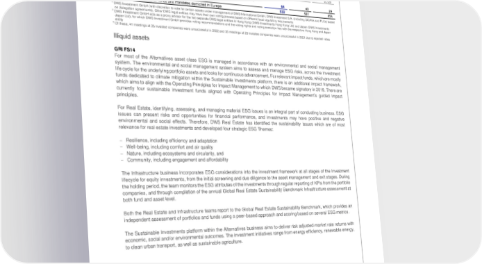 Deutsche Bank Transition toward a sustainable and climate-neutral economy Non-Financial Report 2022 Sustainable finance Proxy Voting and Engagements Dec 31, 2022 Dec 31, 2021 Dec 31, 2020 1 2 For mandates and funds domiciled with DWS legal entities in Europe and Asia (submitted votes3) 3,857 3,242 2,370 3 Companies voted 2,897 2,426 1,859 For mandates and funds domiciled with DWS legal entities in the US (submitted votes) 9,340 9,406 9,355 Companies voted 6,777 6,879 6,720 AGM attendance questions sent to company boards for virtual/physical shareholder meetings for funds and mandates domiciled in Europe 64 40 24 Corporate engagements for funds and mandates domiciled in Europe 532 581 454 1 DWS Investment GmbH (with discretion to vote for certain assets under management of DWS International GmbH, DWS Investment S.A. (including SICAVs and PLCs) based on delegation agreements). Other DWS legal entities may have their own voting process based on different local regulatory requirements 2 DWS Investment GmbH acts as a proxy advisor for the two separate DWS legal entities in Hong Kong (DWS Investments Hong Kong Ltd) and Japan (DWS Investments Japan Ltd), for which DWS Investment GmbH provides voting recommendations and the voting rights and voting execution lies with the respective Hong Kong and Japan entity 3 Of these, 41 meetings at 35 invested companies were unsuccessful in 2022 and 35 meetings at 20 investee companies were unsuccessful in 2021 due to rejected votes Illiquid assets GRI FS14 For most of the Alternatives asset class ESG is managed in accordance with an environmental and social management system. The environmental and social management system aims to assess and manage ESG risks, across the investment life cycle for the underlying portfolio assets and looks for continuous advancement. For relevant impact funds, which are mostly funds dedicated to climate mitigation within the Sustainable Investments platform, there is an additional impact framework, which aims to align with the Operating Principles for Impact Management to which DWS became signatory in 2019. There are currently four sustainable investment funds aligned with Operating Principles for Impact Management’s guided impact principles. For Real Estate, identifying, assessing, and managing material ESG issues is an integral part of conducting business. ESG issues can present risks and opportunities for financial performance, and investments may have positive and negative environmental and social effects. Therefore, DWS Real Estate has identified the sustainability issues which are of most relevance for real estate investments and developed four strategic ESG Themes: – Resilience, including efficiency and adaptation – Well-being, including comfort and air quality – Nature, including ecosystems and circularity, and – Community, including engagement and affordability The Infrastructure business incorporates ESG considerations into the investment framework at all stages of the investment lifecycle for equity investments, from the initial screening and due diligence to the asset management and exit stages. During the holding period, the team monitors the ESG attributes of the investments through regular reporting of KPIs from the portfolio companies, and through completion of the annual Global Real Estate Sustainability Benchmark Infrastructure assessment at both fund and asset level. Both the Real Estate and Infrastructure teams report to the Global Real Estate Sustainability Benchmark, which provides an independent assessment of portfolios and funds using a peer-based approach and scoring based on several ESG metrics. The Sustainable Investments platform within the Alternatives business aims to deliver risk adjusted market rate returns with economic, social and/or environmental outcomes. The investment initiatives range from energy efficiency, renewable energy, to clean urban transport, as well as sustainable agriculture. 36