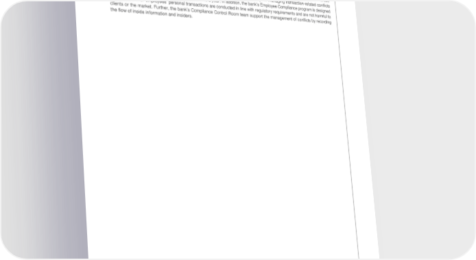 Deutsche Bank Governance and operations Non-Financial Report 2022 Product responsibility Each business division must have measures in place to identify and manage conflicts appropriately, including a Conflicts of Interest Register, which lists conflicts of interest that have arisen or may arise within the division. The maintenance of this register falls within the remit of an oversight body consisting of senior representatives of the division’s management who receive input from Compliance. Beyond the business divisions, the bank has numerous control functions that directly or indirectly manage conflicts of interest. For example, the Business Selection and Conflicts Office is responsible primarily for managing transaction-related conflicts and reports to the Management Board at least once a year. In addition, the bank’s Employee Compliance program is designed to check whether employees’ personal transactions are conducted in line with regulatory requirements and are not harmful to clients or the market. Further, the bank’s Compliance Control Room team support the management of conflicts by recording the flow of inside information and insiders. 95