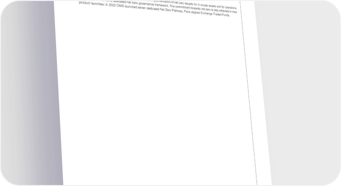 Deutsche Bank Transition toward a sustainable and climate-neutral economy Non-Financial Report 2022 Climate risk DWS will continue to work with organizations and initiatives to further evolve existing standards and to set new standards, specifically with the Paris Aligned Investment Initiative and the Net Zero Asset Owner Alliance. Over the forthcoming years, DWS aims to further work with clients, fund boards and legal entities on its decarbonization goals and to put more assets in scope step by step in line with further regulation and evolving methodologies. In 2023 DWS aims to adopt and implement a coal policy as a next step to deliver on its net zero commitments and act in accordance with the Net Zero Asset Managers initiative. To support those activities and to ensure a seamless implementation of net zero targets for in-scope assets and its operations DWS has established a dedicated net zero governance framework. The commitment towards net zero is also reflected in new product launches; in 2022 DWS launched seven dedicated Net Zero Pathway, Paris aligned Exchange Traded Funds. 51