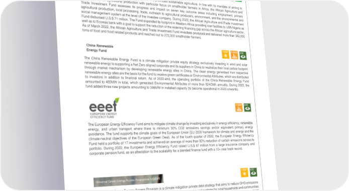 Deutsche Bank Transition toward a sustainable and climate-neutral economy Non-Financial Report 2022 Sustainable finance Highlights The African Agriculture and Trade Investment Fund promotes sustainable agriculture. In line with its mandate of aiming to positively impact agricultural production with particular focus on smallholder farmers in Africa, the African Agriculture and Trade Investment Fund assesses its progress and impact on seven key outcome areas including employment, primary agricultural production, local processing, trade, outreach to agricultural producers, environment, and the environmental and social management system at the level of the investee company. During 2022, the African Agriculture and Trade Investment Fund disbursed U.S.$ 71 million. The Fund expanded its footprint in Western Africa providing loan facilities to UBN Nigeria as well as to Ecowas bank with a goal to support the reduction of the widening financing gap across the African agriculture sector. As of March 2022, the African Agriculture and Trade Investment Fund investees produced and delivered more than 342,000 tons of food and food related products and reached out to 272,000 smallholder farmers. The China Renewable Energy Fund is a climate mitigation private equity strategy exclusively investing in wind and solar renewable energy to supporting a Net Zero aligned corporate and its suppliers in China to neutralize their local carbon footprint through market mechanism by developing renewable energy sites in China. The clean energy generated from respective renewable energy sites are the basis for the fund to receive green certificates or Environmental Attributes, which are distributed to investors in addition to financial return. As of 2022-end, the operating portfolio of the China Renewable Energy Fund amounted to 465MW in total, which generated Environmental Attributes of more than 924GWh annually. During 2022, the fund added three new projects amounting to 396MW in installed capacity (to become operational in 2023 onwards). The European Energy Efficiency Fund aims to mitigate climate change by investing exclusively in energy efficiency, renewable energy, and urban transport where there is minimum 30% CO2 emissions savings and/or equivalent primary energy avoidance. The fund supports the climate goals of the European Union (EU 2030 framework for climate and energy and the climate-neutral objectives of the European Green Deal). As of the fourth quarter of 2022, the European Energy Efficiency Fund held a portfolio of 17 investments and achieved an average of more than 60% reduction of carbon emissions across its portfolio. During 2022, the European Energy Efficiency Fund raised U.S.$ 97 million from a large insurance company and corporate pension fund, as an attestation to the scalability for a blended finance fund with a 10+ year track record. The Universal Green Energy Access Program is a climate mitigation private debt strategy that aims to reduce GHG emissions by investing in decentralized energy service companies for off grid and mini-grid systems for rural households and communities and renewable energy for industrial players. Set up as a blended finance fund, this is the first fund for Deutsche Bank/DWS to be launched with the UN Green Climate Fund, to increase access to clean electrical energy for mainly rural populations in Sub-Saharan Africa. The fund was launched at COP26 in 2021 with U.S.$ 80 million committed from the Green Climate Fund as well as up to U.S.$ 15 million from DWS and aims for operationalization in early 2023. 37