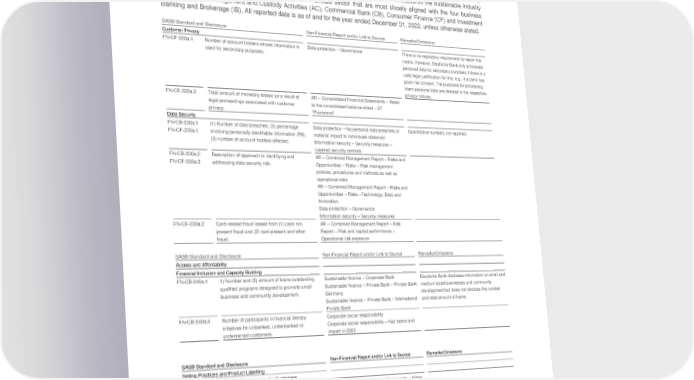 Deutsche Bank Appendix Non-Financial Report 2022 Sustainability Accounting Standards Board (SASB) Index Sustainability Accounting Standards Board (SASB) Index The Non-Financial Report 2022 continues to review and expand on reporting metrics of the Sustainability Accounting Standards Board (SASB) Standards, thus acknowledging their growing importance among investors and businesses. Deutsche Bank continuously strive to improve its disclosure of quantitative metrics and will continue to evaluate potential metrics included in these standards that are not disclosed yet. The bank’s disclosures are based on the Sustainable Industry Classification System (SICS) industries within the Financials sector that are most closely aligned with the four business divisions: Asset Management and Custody Activities (AC), Commercial Bank (CB), Consumer Finance (CF) and Investment Banking and Brokerage (IB). All reported data is as of and for the year ended December 31, 2022, unless otherwise stated. SASB Standard and Disclosure Non-Financial Report and/or Link to Source Remarks/Omissions Customer Privacy FN-CF-220a.1 Number of account holders whose information is Data protection – Governance There is no regulatory requirement to report this used for secondary purposes. metric. However, Deutsche Bank only processes personal data for secondary purposes if there is a valid legal justification for this, e.g., if a client has given his consent. The purposes for processing client personal data are detailed in the respective privacy notices. FN-CF-220a.2 Total amount of monetary losses as a result of AR – Consolidated Financial Statements – Notes legal proceedings associated with customer to the consolidated balance sheet – 27 privacy. “Provisions” Data Security FN-CB-230a.1 (1) Number of data breaches, (2) percentage Data protection – No personal data breaches of Quantitative numbers not reported. FN-CF-230a.1 involving personally identifiable information (PII), material impact to individuals observed (3) number of account holders affected. Information security – Security measures – Layered security controls FN-CB-230a.2 Description of approach to identifying and AR – Combined Management Report – Risks and FN-CF-230a.3 addressing data security risk. Opportunities – Risks – Risk management policies, procedures and methods as well as operational risks AR – Combined Management Report – Risks and Opportunities – Risks –Technology, Data and Innovation Data protection – Governance Information security – Security measures FN-CF-230a.2 Card-related fraud losses from (1) card-not- AR – Combined Management Report – Risk present fraud and (2) card-present and other Report – Risk and capital performance – fraud. Operational risk exposure SASB Standard and Disclosure Non-Financial Report and/or Link to Source Remarks/Omissions Access and Affordability Financial Inclusion and Capacity Building FN-CB-240a.1 1) Number and (2) amount of loans outstanding Sustainable finance – Corporate Bank Deutsche Bank discloses information on small and qualified programs designed to promote small Sustainable finance – Private Bank – Private Bank medium sized businesses and community business and community development. Germany development but does not disclose the number Sustainable finance – Private Bank – International and total amount of loans. Private Bank FN-CB-240a.4 Number of participants in financial literacy Corporate social responsibility initiatives for unbanked, underbanked or Corporate social responsibility – Key topics and underserved customers. impact in 2022 SASB Standard and Disclosure Non-Financial Report and/or Link to Source Remarks/Omissions Selling Practices and Product Labelling Transparent Information and Fair Advice for Customers FN-AC-270a.2 Total amount of monetary losses as a result of AR – Consolidated Financial Statements – Notes legal proceedings associated with marketing and to the consolidated balance sheet – 27 communication of financial product-related “Provisions” information to new and returning customers. FN-AC-270a.3 Description of approach to informing customers Product responsibility about products and services. Product responsibility – Product suitability and appropriateness Product responsibility – Selling practices and marketing Selling Practices FN-CF-270a.4 (1) Number of complaints filed with the Consumer Client satisfaction – Complaint management Information on client complaints is disclosed, but Financial Protection Bureau (CFPB), (2) complaints filed with the CFPB are not displayed percentage with monetary or non-monetary relief, due to confidentiality constraints. (3) percentage disputed by consumer, (4) percentage that resulted in investigation by the CFPB. 148