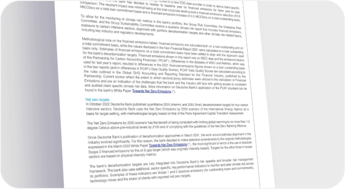 Deutsche Bank Transition toward a sustainable and climate-neutral economy Non-Financial Report 2022 Climate risk Other significant factors were (at the total corporate lending level and on a total loan commitment basis): (i) client specific emission factors decreasing due to rising Enterprise Values including cash (EVICs) from 2020 to 2021 which led to a financed emissions reduction of 1.3 MtCO2e/y; (ii) client’s moving from proxy to client specific emission factors which led to a financed emissions reduction of 1.4 MtCO2e/y; and (iii) FX translation effects of the euro equivalent loan exposures which led to a financed emissions increase of 1.7 MtCO2e/y, due to U.S. dollar strengthening versus the euro from year end 2021 to year end 2022. In Q3 2022, the bank’s financed emissions methodology moved to a new ESG data provider in order to derive client specific emission factors and the bank has decided to restate its baseline year for financed emissions for fairer year-on-year comparison. The resultant impact was minimal being at the total corporate lending level a financed emissions reduction of 0.9 MtCO2e/y on a total loan commitment basis and a financed emissions increase of 0.5 MtCO2e/y on a loan outstanding basis. To allow for the monitoring of climate risk metrics in the bank’s portfolio, the Group Risk Committee, the Enterprise Risk Committee, and the Group Sustainability Committee receive a quarterly climate risk report that includes financed emissions, exposure to carbon-intensive sectors, alignment with portfolio decarbonization targets and other climate risk-related topics, including key industry and regulatory developments. Methodological note on the financed emissions tables: financed emissions are calculated both on a loan outstanding and on a total commitment basis, while the values disclosed in the Non-Financial Report 2021 were calculated on a loan outstanding basis only. Estimates of financed emissions on a total commitment basis have been added to align with the approach used for the bank’s decarbonization targets. Financed emissions shown in this report rely on MSCI data and the emissions factors of the Partnership for Carbon Accounting Financials (“PCAF”). Differences in the datasets of MSCI and Refinitiv, which was used for last year’s report, resulted in differences in the 2021 financed emissions figures shown on a loan outstanding basis in the two reports (and in differences in PCAF’s Data Quality Scores). PCAF Data Quality Scores are calculated according to the rules outlined in the Global GHG Accounting and Reporting Standard for the Financial Industry, published by the Partnership. Current scores reflect the extent to which sectoral proxy estimates were utilized in the calculation of Financed Emissions and are an indication of the challenges that the bank and the industry still face with getting access to consistent and audited client specific climate risk data. More information on Deutsche Bank’s application of the PCAF standard can be found in the bank’s White Paper Towards Net Zero Emissions (*). Net zero targets In October 2022 Deutsche Bank published quantitative 2030 (interim) and 2050 (final) decarbonization targets for four carbon intensive sectors. Deutsche Bank uses the Net Zero Emissions by 2050 scenario of the International Energy Agency as a basis for target setting, with methodologies largely based on that of the Paris Agreement Capital Transition Assessment. The Net Zero Emissions by 2050 scenario has the benefit of being consistent with limiting global warming to no more than 1.5 degree Celsius above pre-industrial levels by 2100 and of complying with the guidelines of the Net-Zero Banking Alliance. Since Deutsche Bank’s publication of decarbonization approaches in March 2021, the work around pathway alignment in the industry evolved significantly. For this reason, the bank decided to make selective amendments to the original methodologies expressed in the March 2022 White Paper Towards Net Zero Emissions (*) , the most significant of which is the use of absolute Scope 3 financed emissions for the oil & gas target (which was originally intensity-based). Targets for the other three in-scope sectors are based on physical intensity metrics. The bank’s decarbonization targets are fully integrated into Deutsche Bank’s risk appetite and broader risk management framework. The bank also uses additional, sector-specific, key performance indicators to monitor and steer climate risk across its portfolios. Examples of these indicators are Scope 1 and 2 absolute emissions (for outstanding loans and commitments), technology mixes and the share of clients with reported net zero targets. 47
