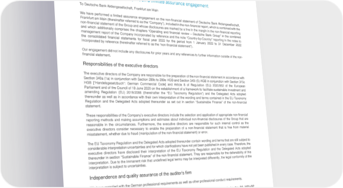 Deutsche Bank Appendix Non-Financial Report 2022 Reports of the independent auditor Reports of the independent auditor The assurance engagement performed by Ernst & Young (EY) relates exclusively to the German version of the “Non-Financial Statement 2022” of Deutsche Bank Aktiengesellschaft, Frankfurt am Main. The following text is a translation of the original German independent assurance report. Independent auditor’s report on a limited assurance engagement To Deutsche Bank Aktiengesellschaft, Frankfurt am Main We have performed a limited assurance engagement on the non-financial statement of Deutsche Bank Aktiengesellschaft, Frankfurt am Main (thereinafter referred to as the “Company”), included in the non-financial report, which is combined with the non-financial statement of the Group and whose disclosures are marked by a line in the margin in the non-financial reporting and which additionally comprises the chapters “Operating and financial review – Deutsche Bank Group” in the combined management report of the Company incorporated by reference and the note “Country-by-Country” reporting in the notes to the consolidated financial statements for fiscal year 2022 for the period from 1 January 2022 to 31 December 2022 incorporated by reference (hereinafter referred to as the “non-financial statement”). Our engagement did not include any disclosures for prior years and any references to further information outside of the non- financial statement. Responsibilities of the executive directors The executive directors of the Company are responsible for the preparation of the non-financial statement in accordance with Section 340a (1a) in conjunction with Section 289c to 289e HGB and Section 340i (5) HGB in conjunction with Section 315c HGB [“Handelsgesetzbuch”: German Commercial Code] and Article 8 of Regulation (EU) 2020/852 of the European Parliament and of the Council of 18 June 2020 on the establishment of a framework to facilitate sustainable investment and amending Regulation (EU) 2019/2088 (thereinafter the “EU Taxonomy Regulation”) and the Delegated Acts adopted thereunder as well as in accordance with their own interpretation of the wording and terms contained in the EU Taxonomy Regulation and the Delegated Acts adopted thereunder as set out in section “Sustainable Finance” of the non-financial statement. These responsibilities of the Company’s executive directors include the selection and application of appropriate non-financial reporting methods and making assumptions and estimates about individual non-financial disclosures of the Group that are reasonable in the circumstances. Furthermore, the executive directors are responsible for such internal control as the executive directors consider necessary to enable the preparation of a non-financial statement that is free from material misstatement, whether due to fraud (manipulation of the non-financial statement) or error. The EU Taxonomy Regulation and the Delegated Acts adopted thereunder contain wording and terms that are still subject to considerable interpretation uncertainties and for which clarifications have not yet been published in every case. Therefore, the executive directors have disclosed their interpretation of the EU Taxonomy Regulation and the Delegated Acts adopted thereunder in section “Sustainable Finance” of the non-financial statement. They are responsible for the defensibility of this interpretation. Due to the immanent risk that undefined legal terms may be interpreted differently, the legal conformity of the interpretation is subject to uncertainties. Independence and quality assurance of the auditor’s firm We have complied with the German professional requirements as well as other professional conduct requirements. Our audit firm applies the national legal requirements and professional pronouncements, in particular the BS WP/vBP (“Berufssatzung für Wirtschaftsprüfer/vereidigte Buchprüfer”: Professional Charter for German Public Accountants/German Sworn Auditors) in the exercise of their profession and the IDW Standard on Quality Management in the Audit Firm (IDW QS 1) and accordingly maintains a comprehensive quality management system that includes documented policies and procedures with regard to compliance with professional ethical requirements, professional standards as well as relevant statutory and other legal requirements.. Responsibilities of the auditor Our responsibility is to express a conclusion with limited assurance on the non-financial statement based on our assurance engagement. 126
