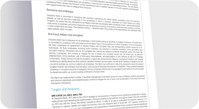 Deutsche Bank Governance and operations Non-Financial Report 2022 Anti-financial crime Money laundering and terrorist financing Money laundering and terrorist financing are significant risks to Deutsche Bank, e.g., in the Corporate Bank which provides banking facilities to correspondent banks and their customers. To control these risks, minimum control standards are defined including, among others, risk-based client due diligence, the monitoring of transactions, name list screening, investigation of alerts and the filing of suspicious activity reports to authorities. These Suspicious Activity Reports can be triggered by alerts from Transaction Monitoring, internal referrals from employees, enquiries of law enforcement or referrals from other banks. Further measures include assessing the risk exposure in the client population and reducing the exposure through, for example, terminating relevant client relationships and liquidating or reducing risk in relevant and associated positions. The Anti-Money Laundering Policy contains the minimum control requirements and is updated regularly in line with regulatory developments and supplemented with internal safeguarding measures. Sanctions and embargos Deutsche Bank is committed to complying with sanctions imposed by the United Nations, European Union, and Germany globally as well as sanctions applicable in the jurisdictions in which it operates, especially the United States and United Kingdom. To control this risk, transactions are filtered, client and counterparty data is screened, trade in sanctioned financial instruments is restricted, and further measures such as rejecting or freezing a transaction, restricting client activities, or exiting a client relationship are taken. The Sanctions Policy – Deutsche Bank Group sets out the requirements and standards that apply globally within the bank. Anti-fraud, bribery and corruption Deutsche Bank has no tolerance for its employees, or third parties acting on its behalf, to engage in bribery or corruption and is committed to compliance with anti-bribery and corruption laws in the jurisdictions in which it operates. On an annual basis the Bank undertakes an assessment of inherent bribery and corruption risks and corresponding controls across all of its businesses. All Bank employees, including board members, are required to complete mandatory online anti-bribery and corruption training. Employees who do not complete their training are subject to potential disciplinary action. The bank has policies, procedures, and controls to mitigate the risk of bribery and corruption across key risk areas such as gifts and entertainment, hiring practices, use of third-party intermediaries, and participation in joint ventures as well as in strategic investments. These controls include the escalation of approvals, enhanced due diligence, contractual limitations, and ongoing monitoring to identify behaviors that could be indicative of bribery and corruption. As with all AFC policies, changes to the anti- corruption policies are communicated to all employees. The Bank has continued to reduce its exposure to areas that present a higher inherent risk of bribery and corruption, such as use of Business Development Consultants. Finally, potential instances of bribery or corruption would be investigated, and any employee determined to be engaged in such behavior would be subject to disciplinary action up to and including termination of employment. The Bank has implemented a holistic Fraud Risk Management Framework across all Lines of Defense, defining governance and minimum standards, and establishing key controls to mitigate the risk of fraud, such as Mandatory Time Away and Fraud Transaction Monitoring. Targets and measures GRI 2-24/26, 3-3, 205-2, 404-2, FS4 At Deutsche Bank, AFC defines the uniform strategy for the prevention of financial crime, including the preparation of group- wide policies and overseeing the implementation. The accountability for the definition and regular review of the risks controlled by AFC lies with the Group Anti-Money Laundering Officer. In order to be able to understand the required measures, it is important to capture, identify and weigh the financial crime risk Deutsche Bank is faced with. AFC regularly conducts an analysis of the financial crime risks and prepares a risk assessment for Deutsche Bank Group, as well as relevant subsidiaries to the extent required by applicable legal requirements. The risk analysis is reviewed annually and approved by the responsible Management Board member. Changes within the organization, but also the offering of new products can have an impact on the bank’s risk exposure. AFC is involved in structural divisional changes such as new products, new lines of business, expansions to new countries or new client categories to ensure the changes are within the Bank’s risk appetite and that effective risk assessment, monitoring and controls are defined before their launch. In order to adjust the strategy in a timely way to an ever-changing legal environment, AFC monitors requirements and advises and supports the Management Board and employees in the business divisions on changed requirements and their implementation into relevant policies. 87