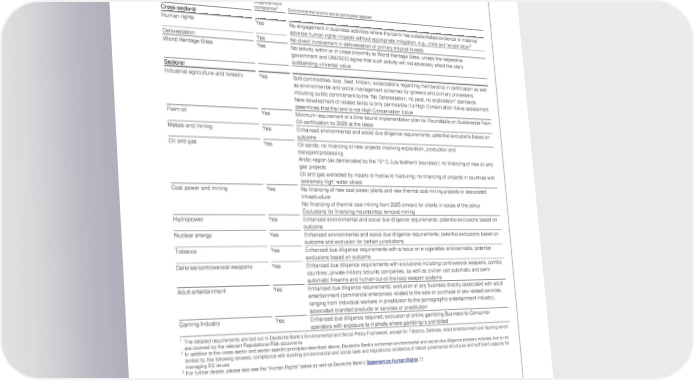 Deutsche Bank Transition toward a sustainable and climate-neutral economy Non-Financial Report 2022 Environmental and social due diligence The enhanced environmental and social due diligence requirements address sectoral issues as well as cross-sectoral issues like biodiversity or social issues. The bank reviews the scope of sectors as well as related due diligence requirements on a best effort basis. It also observes prevailing sector-related environmental and social standards and industry best practices in order to improve understanding of environmental and social issues and, if necessary, adjust its approach. The bank’s assessment also takes into account developments in this area, such as climate protection and the respect of human rights. Main positions and minimum standards of environmental and social due diligence1 Enhanced due diligence/norm 2 Area compliance Environmental and/or social principles applied Cross-sectoral Human rights Yes No engagement in business activities where the bank has substantiated evidence of material 3 adverse human rights impacts without appropriate mitigation, e.g., child and forced labor Deforestation Yes No direct involvement in deforestation of primary tropical forests World Heritage Sites Yes No activity within or in close proximity to World Heritage Sites, unless the respective government and UNESCO agree that such activity will not adversely affect the site’s outstanding universal value Sectoral Industrial agriculture and forestry Yes Soft commodities (soy, beef, timber): expectations regarding membership in certification as well as environmental and social management schemes for growers and primary processers, including public commitment to the “No Deforestation, no peat, no exploitation” standards New development of related lands is only permissible if a High Conservation Value assessment determines that the land is not High Conservation Value Palm oil Yes Minimum requirement of a time-bound implementation plan for Roundtable on Sustainable Palm Oil-certification by 2025 at the latest Metals and mining Yes Enhanced environmental and social due diligence requirements; potential exclusions based on outcome Oil and gas Yes Oil sands: no financing of new projects involving exploration, production and transport/processing Arctic region (as demarcated by the 10° C July Isotherm boundary): no financing of new oil and gas projects Oil and gas extracted by means of hydraulic fracturing: no financing of projects in countries with ‘extremely high’ water stress Coal power and mining Yes No financing of new coal power plants and new thermal coal mining projects or associated infrastructure No financing of thermal coal mining from 2025 onward for clients in scope of the policy Exclusions for financing mountaintop removal mining Hydropower Yes Enhanced environmental and social due diligence requirements; potential exclusions based on outcome Nuclear energy Yes Enhanced environmental and social due diligence requirements; potential exclusions based on outcome and exclusion for certain jurisdictions Tobacco Yes Enhanced due diligence requirements with a focus on e-cigarettes and cannabis; potential exclusions based on outcome Defense/controversial weapons Yes Enhanced due diligence requirements with exclusions including controversial weapons, conflict countries, private military security companies, as well as civilian use automatic and semi- automatic firearms and human-out-of-the-loop weapon systems Adult entertainment Yes Enhanced due diligence requirements; exclusion of any business directly associated with adult entertainment (commercial enterprises related to the sale or purchase of sex-related services, ranging from individual workers in prostitution to the pornographic entertainment industry), associated branded products or services or prostitution Gaming Industry Yes Enhanced due diligence required; exclusion of online gambling Business-to-Consumer operators with exposure to markets where gambling is prohibited 1 The detailed requirements are laid out in Deutsche Bank’s Environmental and Social Policy Framework, except for Tobacco, Defense, Adult entertainment and Gaming which are covered by the relevant Reputational Risk documents 2 In addition to the cross-sector and sector-specific principles described above, Deutsche Bank’s enhanced environmental and social due diligence process includes, but is not limited to, the following reviews: compliance with existing environmental and social laws and regulations; existence of robust governance structures and sufficient capacity for managing ES issues 3 For further details, please also see the “Human Rights” below as well as Deutsche Bank’s Statement on Human Rights (*) Commitments, targets, and measures GRI 3-3, FS3 Deutsche Bank strives to manage all types of risk as effectively and efficiently as possible. This involves properly identifying transactions and/or clients that pose potential environmental and social risks, particularly in sectors with elevated environmental and social risk as internally defined and conducting robust due diligence. The bank also works to continually improve its environmental and social performance, in particular by verifying the effectiveness of its processes and guidelines and, if necessary, amending them, and by providing training to all relevant employees to reinforce their awareness and focus. The Group Sustainability function within the Chief Sustainability Office is responsible for designing standards and policies for environmental and social due diligence and sustainable finance and for overseeing business adherence to these. Headquartered in Frankfurt, Germany, the team expanded its regional presence to UK and Asia-Pacific in 2022. The bank also increased the number of environmental and social specialists in its business units. 54