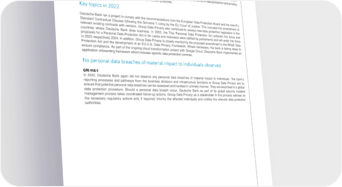 Deutsche Bank Governance and operations Non-Financial Report 2022 Data protection New regulatory developments in data protection are continuously monitored and information is shared about them with the local Data Protection Officers to assess their relevance and potential consequences for the bank. If a need for adjustments to processes and products is identified, implementation actions are agreed with the business divisions and infrastructure functions. In addition, awareness of employees on data protection is fostered by internal online events and intranet posts. For example, in 2022 Group Data Privacy organized several regional webinars to raise more awareness on the importance of data protection and privacy, on handling of personal data, where to get support for data protection matters in the bank, what are individual’s rights, best practices for organizations to protect personal data, principles and trends in data protection and privacy and what can be the consequences of poor data protection practices. Key topics in 2022 Deutsche Bank ran a project to comply with the recommendations from the European Data Protection Board and the new EU Standard Contractual Clauses following the Schrems II ruling by the EU Court of Justice. This included the amendment of relevant existing contracts with vendors. Group Data Privacy also continued to assess new data protection legislation in the countries where Deutsche Bank does business. In 2022, the Thai Personal Data Protection Act entered into force and proposals for a Personal Data Protection Act in Sri Lanka and Indonesia were ratified by parliaments and will enter into force in 2023 respectively 2024. In addition, Group Data Privacy is closely monitoring the proposed amendment to the British Data Protection Act and the development of an EU-U.S. Data Privacy Framework. Where necessary, the bank is taking steps to ensure compliance. As part of the ongoing cloud transformation project with Google Cloud, Deutsche Bank implemented an application onboarding framework which includes specific data protection controls. No personal data breaches of material impact to individuals observed GRI 418-1 In 2022, Deutsche Bank again did not observe any personal data breaches of material impact to individuals. The bank’s reporting processes and pathways from the business divisions and infrastructure functions to Group Data Privacy aim to ensure that potential personal data breaches can be assessed and handled in a timely manner. They are described in a global data protection procedure. Should a personal data breach occur, Deutsche Bank as part of its global security incident management process takes coordinated follow-up actions. Group Data Privacy as a stakeholder in this process advises on the necessary regulatory actions and, if required, informs the affected individuals and notifies the relevant data protection authorities. 92