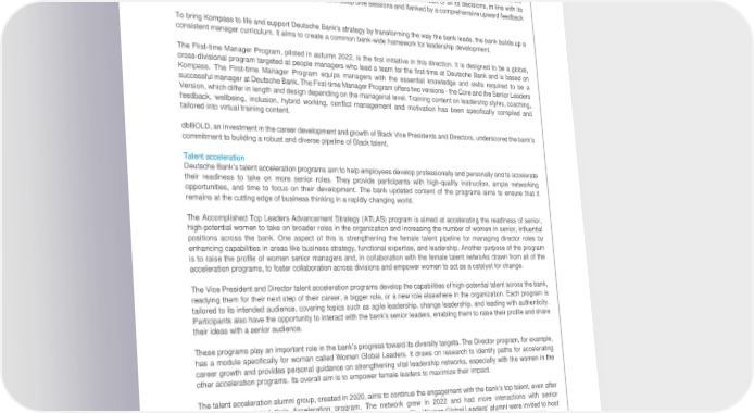Deutsche Bank Employees and corporate social responsibility Non-Financial Report 2022 Employment and employability Leadership development Through its Leadership Kompass (Kompass) the bank has set out eight behaviors that support its way forward and serve as a guide on how the bank can bring its leadership DNA to life. The Kompass specifies the leadership standards for the bank. It provides guidance for the bank’s leadership culture and shows where it needs to build its capabilities. A complex and fast- moving environment requires new ways of working together, connecting, and leading with purpose, based on a common leadership language, vision and behaviors. Kompass sets out the behaviors that support sustainable business practices, the development and well-being of its people and the way the bank puts customers at the heart of all its decisions, in line with its values and beliefs. Kompass behaviors are explored in deep dive sessions and flanked by a comprehensive upward feedback tool in 2023. To bring Kompass to life and support Deutsche Bank's strategy by transforming the way the bank leads, the bank builds up a consistent manager curriculum. It aims to create a common bank-wide framework for leadership development. The First-time Manager Program, piloted in autumn 2022, is the first initiative in this direction. It is designed to be a global, cross-divisional program targeted at people managers who lead a team for the first-time at Deutsche Bank and is based on Kompass. The First-time Manager Program equips managers with the essential knowledge and skills required to be a successful manager at Deutsche Bank. The First-time Manager Program offers two versions - the Core and the Senior Leaders Version, which differ in length and design depending on the managerial level. Training content on leadership styles, coaching, feedback, wellbeing, inclusion, hybrid working, conflict management and motivation has been specifically compiled and tailored into virtual training content. dbBOLD, an investment in the career development and growth of Black Vice Presidents and Directors, underscores the bank’s commitment to building a robust and diverse pipeline of Black talent. Talent acceleration Deutsche Bank’s talent acceleration programs aim to help employees develop professionally and personally and to accelerate their readiness to take on more senior roles. They provide participants with high-quality instruction, ample networking opportunities, and time to focus on their development. The bank updated content of the programs aims to ensure that it remains at the cutting edge of business thinking in a rapidly changing world. The Accomplished Top Leaders Advancement Strategy (ATLAS) program is aimed at accelerating the readiness of senior, high-potential women to take on broader roles in the organization and increasing the number of women in senior, influential positions across the bank. One aspect of this is strengthening the female talent pipeline for managing director roles by enhancing capabilities in areas like business strategy, functional expertise, and leadership. Another purpose of the program is to raise the profile of women senior managers and, in collaboration with the female talent networks drawn from all of the acceleration programs, to foster collaboration across divisions and empower women to act as a catalyst for change. The Vice President and Director talent acceleration programs develop the capabilities of high-potential talent across the bank, readying them for their next step of their career, a bigger role, or a new role elsewhere in the organization. Each program is tailored to its intended audience, covering topics such as agile leadership, change leadership, and leading with authenticity. Participants also have the opportunity to interact with the bank’s senior leaders, enabling them to raise their profile and share their ideas with a senior audience. These programs play an important role in the bank’s progress toward its diversity targets. The Director program, for example, has a module specifically for woman called Women Global Leaders. It draws on research to identify paths for accelerating career growth and provides personal guidance on strengthening vital leadership networks, especially with the women in the other acceleration programs. Its overall aim is to empower female leaders to maximize their impact. The talent acceleration alumni group, created in 2020, aims to continue the engagement with the bank’s top talent, even after they have completed their Acceleration program. The network grew in 2022 and had more interactions with senior management and with each other in talent-develops-talent sessions. The Women Global Leaders’ alumni were invited to host small career coaching circles for the Vice President participants, a new and successful addition to the programs in 2022. The Schneider-Lenné Cadre named after Ellen Schneider-Lenné, the first woman on Deutsche Bank’s Management Board, is a community of the bank’s senior women leaders consisting of senior management risk takers as well as current and former ATLAS participants. Cadre members discuss key issues with senior management, support the development of female talent, and accelerate cultural change, particularly to help the bank achieve its gender diversity targets. 114