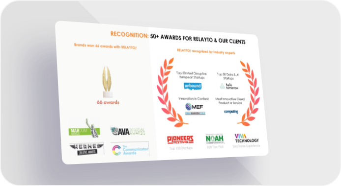 RECOGNITION: 50+ AWARDS FOR RELAYTO & OUR CLIENTS Brands won 66 awards with RELAYTO/RELAYTO/ recognized by industry experts Top 50 Most Disruptive Top 50 Data & AI European StartupsStartups Innovation in ContentMost Innovative Cloud Product or Service Top 100 StartupsB2B Top PickEmployee Experience