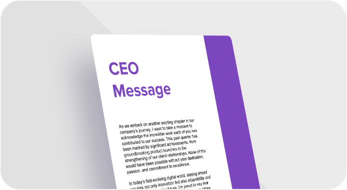 CEO Message As we embark on another exciting chapter in our company’s journey, I want to take a moment to acknowledge the incredible work each of you has contributed to our success. This past quarter has been marked by significant achievements, from groundbreaking product launches to the strengthening of our client relationships. None of this would have been possible without your dedication, passion, and commitment to excellence. In today’s fast-evolving digital world, staying ahead requires not only innovation but also adaptability and a shared vision for the future. I’m proud to say that we have continuously demonstrated these qualities, pushing boundaries and setting new standards in our industry. Our team's ability to embrace challenges and transform them into opportunities has positioned us as leaders, and I believe we are just getting started. CEO Lara Vit