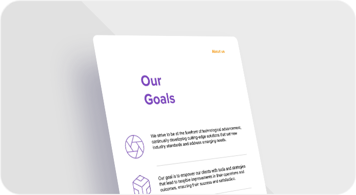 About us Our Goals We strive to be at the forefront of technological advancement, continually developing cutting-edge solutions that set new industry standards and address emerging needs. Our goal is to empower our clients with tools and strategies that lead to tangible improvements in their operations and outcomes, ensuring their success and satisfaction. We are committed to building sustainable solutions that support long-term growth for our clients and our company, balancing innovation with environmental and social responsibility. As we move forward, our commitment to these goals remains unwavering. By continuously innovating, enhancing client success, and fostering sustainable growth, we are not only shaping the future of digital technology but also setting the stage for our collective achievements.