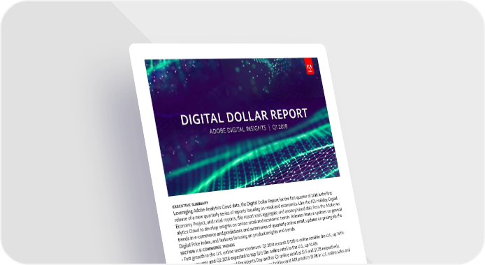 The Digital Dollar leverages Adobe Sensei to identify retail insights from trillions of data points that flow through Adobe Analytics. Adobe’s retail report, the most comprehensive set of insights and predictions of its kind in the industry, is based on an analysis of more than one trillion aggregated and anonymized visits to over 4,500 retail sites and 55 million SKUs. Adobe Analytics measures online transactions at 80 of the largest 100 U.S. web retailers. All use of the data, insights, and assets from this presentation are property of Adobe but can be used with appropriate citations. Please cite data, insights, or assets from this report and any derivatives as “Adobe Digital Insights analysis of Adobe Analytics data”. The Digital Price Index price changes are measured using the Fisher Ideal Price Index model. Our special thanks to Pete Klenow at Stanford University and Austan Goolsbee at the University of Chicago for their con- tinued advice and guidance on the Digital Economy Project and Digital Price Index. DIGITAL DOLLAR: RETAIL AND ECONOMICS UPDATE 2018Q1
