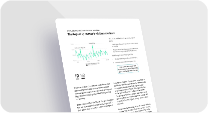 The shape of daily Q1 revenue is much flatter when Looking over Quarter 1 by day of the week helps to compared to the holiday season, where extreme explain the trend in revenue over the three months. revenue spikes are the norm, as a result of the year’s As expected, Mondays are high in general with biggest online shopping days: Black Friday and Cy- an average revenue of $1.36B. This is partially due ber Monday. to the two holidays, MLK Jr. Day and Presidents Day, falling on Mondays. Despite their importance, While other holidays like MLK Jr. Day and President’s removing these two holidays from the average still Day are increasing their importance, they’re still in keeps Mondays the highest average revenue day of their infant stage in terms of online shopping reve- the week. nue. Comparatively, Saturdays drove on average 19% less Average Revenue by Day of Week (Q1 2018) revenue than Mondays. Over the course of the year, Monday $1.36B Saturdays are the worst day of the week for online shopping by a significant margin: nearly $100 million Tuesday $1.27B dollars. Wednesday $1.29B Thursday $1.26B Every retailer should be aware of their own con- Friday $1.19B sumer buying cycle, and of the shape of their own Saturday $1.10B season. Focusing around the first week of January Sunday $1.22B and the two major holidays for Q1 is a good starting point. DIGITAL DOLLAR: RETAIL AND ECONOMICS UPDATE 2018Q1
