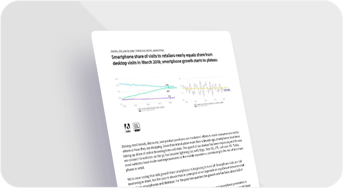 Driving retail trends, discounts, and product purchases are marketers’ efforts to reach consumers no matter where or how they are shopping. Since their introduction more than a decade ago, smartphones have been taking up share of online browsing time and visits. The speed of our devices has been improving and the way we connect to websites on the go has become lightning fast with Edge, then 3G, LTE, and soon 5G. Today, most websites have made vast improvements to the mobile experience, contributing to the rise of the smart- phone in retail. We’re now seeing that visit growth from smartphones is beginning to level off. Smartphone visits are still increasing in share, but the pace is slower than in years past as we approach an equilibrium between retail visits from smartphones and desktops. For the past two quarters the growth rate has been about half of what it was in 2014. A lot of improvements to the mobile experience have already been made, and smartphone penetration is already high in the U.S. Until that next revolution in smartphone technology, we don’t expect to see big leaps in smartphone visits. For more data on trends in smartphones, particularly the mobile checkout experience, see the Appendix. DIGITAL DOLLAR: RETAIL AND ECONOMICS UPDATE 2018Q1