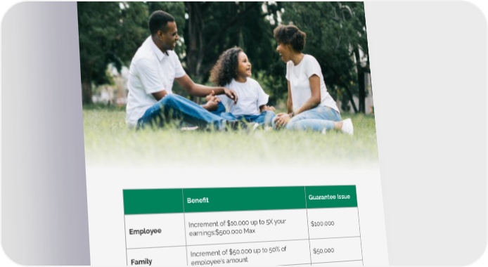 Beneļ¬t Guarantee Issue Increment of $10.000 up to 5X your Employee $100,000 earnings:$500.000 Max Increment of $50.000 up to 50% of Family $50,000 employee's amount Child $10,000 $10,000 13