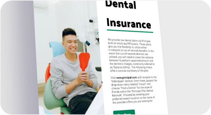 5. Dental Insurance We provide two dental plans via Principal, both of which are PPO plans. These plans give you the flexibility to utilize either in-network or out-of-network benefits. In the event that out-of-network dentists are utilized, you will need to cover the variance between Guardian's approved amount and the dentist's charges, commonly referred to as "balance billing". The following charts offer a concise summary of the plan. Visit www.principal.com and navigate to the "Individuals" section. From there, access the drop-down menu labeled "Insure" and choose "Find a Dentist" for the state of Florida within the "Principal Plan Dental Network". Proceed by entering your preferred search location or the name of the provider/office you are looking for. See More 448