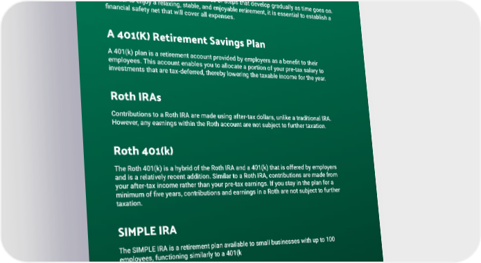 9. Retirement Plans Planning for retirement involves a series of steps that develop gradually as time goes on. In order to enjoy a relaxing, stable, and enjoyable retirement, it is essential to establish a financial safety net that will cover all expenses. A 401(K) Retirement Savings Plan A 401(k) plan is a retirement account provided by employers as a benefit to their employees. This account enables you to allocate a portion of your pre-tax salary to investments that are tax-deferred, thereby lowering the taxable income for the year. Roth IRAs Contributions to a Roth IRA are made using after-tax dollars, unlike a traditional IRA. However, any earnings within the Roth account are not subject to further taxation. Roth 401(k) The Roth 401(k) is a hybrid of the Roth IRA and a 401(k) that is offered by employers and is a relatively recent addition. Similar to a Roth IRA, contributions are made from your after-tax income rather than your pre-tax earnings. If you stay in the plan for a minimum of five years, contributions and earnings in a Roth are not subject to further taxation. SIMPLE IRA The SIMPLE IRA is a retirement plan available to small businesses with up to 100 employees, functioning similarly to a 401(k SEP IRA A Simplified Employee Pension (SEP) IRA enables self-employed individuals without employees to set aside a portion of their income for retirement in their own account. These contributions are fully deductible from taxable income. 15