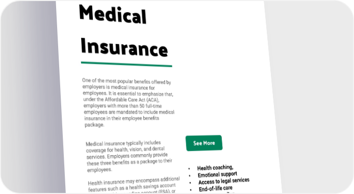 4. Medical Insurance One of the most popular benefits offered by employers is medical insurance for employees. It is essential to emphasize that, under the Affordable Care Act (ACA), employers with more than 50 full-time employees are mandated to include medical insurance in their employee benefits package. Medical insurance typically includes See More coverage for health, vision, and dental services. Employers commonly provide these three benefits as a package to their employees. • Health coaching, • Emotional support Health insurance may encompass additional • Access to legal services features such as a health savings account (HSA), flexible spending account (FSA), or • End-of-life care health reimbursement account (HRA). • Grief counseling Certain employers provide one or all three of these choices. It is crucial to clarify to your staff the distinctions among these options and the advantages they may offer. 46