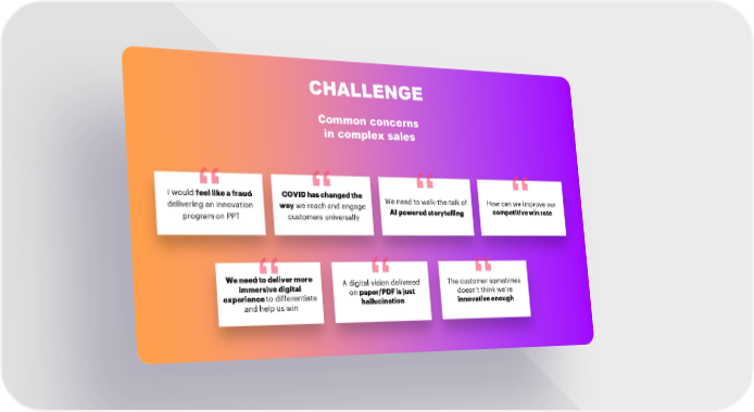 CHALLENGE Common concerns in complex sales I would feel like a fraud COVID has changed the We need to walk-the-talk of How can we improve our delivering an innovation waywe reach and engage AI powered storytelling competitive win rate program on PPT customers universally We need to deliver more A digital vision delivered The customer sometimes immersive digital on paper/PDF is just doesn’t think we’re experience to differentiate hallucination innovative enough and help us win