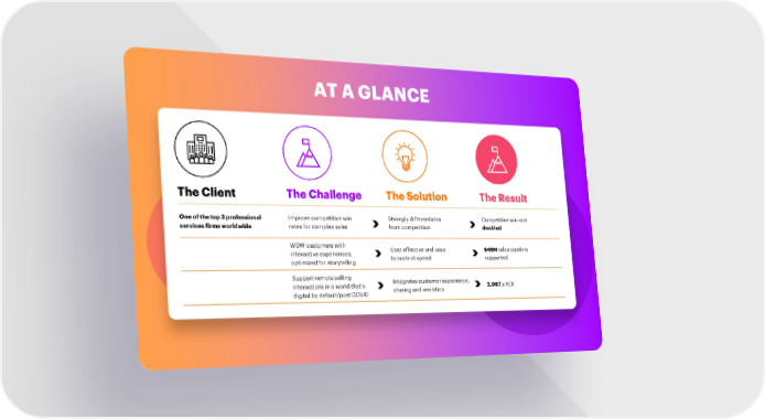 AT A GLANCE The Client The Challenge The Solution The Result One of the top 3 professional Improve competitive win Strongly differentiates Competitive win rate services firmsworldwide rates for complex sales from competition doubled WOW customers with Cost effective and easy $4BN sales pipeline interactive experiences, to scale at speed supported optimized for storytelling Support remote selling Integrates customer experience, interactions in a world that’s sharing and analytics 2,087x ROI digital by default/post COVID