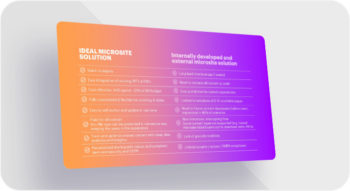 IDEAL MICROSITE SOLUTION Quick to deploy Long lead time (average 2 weeks) Easy integration of existing PPTs & PDFs Need to recreate all content as code Cost effective. AVG spend -.05% of BD budget Cost prohibitive for custom experiences Fully customized & flexible for scrolling & slides Limited to templates of 5-10 scrollable pages Easy to self-author and update in real-time Need to freeze content days/weeks before event, impractical in 90% of scenarios Fluid for all content Non-immersive, interrupting flow Any file type can be presented in immersive way, Some content types not supported (e.g, typical keeping the users in the experience microsite kicked users out to download static PDFs) Track and optimize shared content with deep dive Lack of granular analytics analytics and insights Personalized sharing with robust and compliant Limitedsecurity / access / GDPR compliance back-end security and GDPR