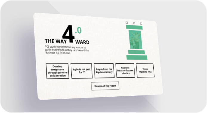 .0 4 THE WAY WARD TCS study highlights five key lessons to guide businesses as they race toward the Business 4.0 finish line. Develop No more ecosystems Agile is not just Buy-in from the Think industry-focused through genuine for IT top is necessary 'Machine first' blinders collaboration Download the report