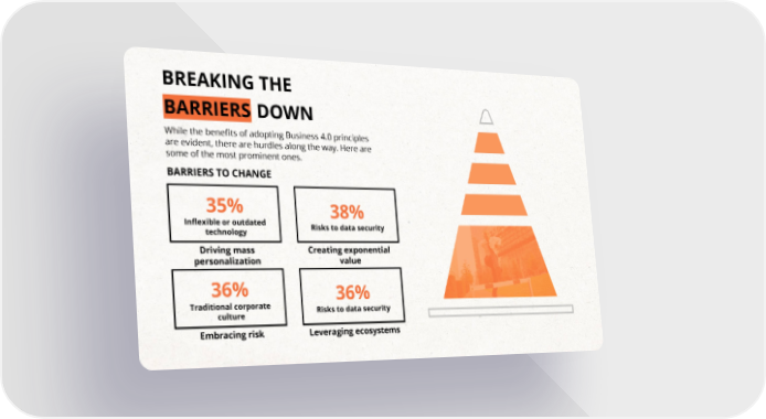 BREAKING THE BARRIERS DOWN While the benefits of adopting Business 4.0 principles are evident, there are hurdles along the way. Here are some of the most prominent ones. BARRIERS TO CHANGE 35% 38% Inflexible or outdated Risks to data security technology Driving mass Creating exponential personalization value 36% 36% Traditional corporate Risks to data security culture Embracing risk Leveraging ecosystems