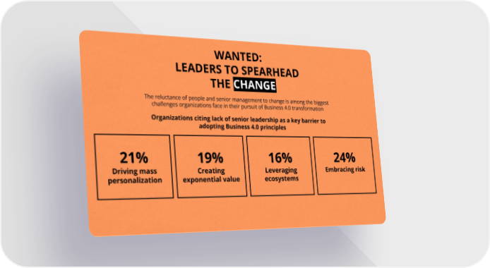 WANTED: LEADERS TO SPEARHEAD CHANGE THE change The reluctance of people and senior management to change is among the biggest challenges organizations face in their pursuit of Business 4.0 transformation Organizations citing lack of senior leadership as a key barrier to adopting Business 4.0 principles 24% 21% 19% 16% Embracing risk Driving mass Creating Leveraging personalization exponential value ecosystems