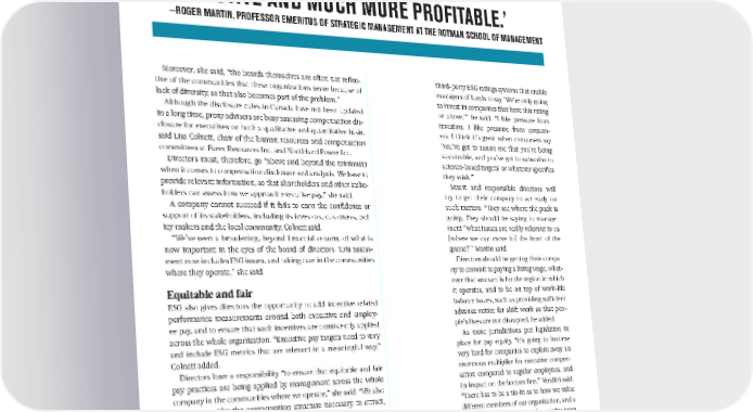 ‘IF YOU PAY THEM WELL, THEY DO A MUCH BETTER JOB, MAKE YOU MUCH MORE PRODUCTIVE AND MUCH MORE PROFITABLE.’ —ROGER MARTIN, PROFESSOR EMERITUS OF STRATEGIC MANAGEMENT AT THE ROTMAN SCHOOL OF MANAGEMENT Moreover, she said, “the boards themselves are often not reflec- third-party ESG ratings systems that enable tive of the communities that these organizations serve because of managers of funds to say ‘We’re only going lack of diversity, so that also becomes part of the problem.” to invest in companies that have this rating Although the disclosure rules in Canada have not been updated or above,’” he said. “I like pressure from in a long time, proxy advisers are busy assessing compensation dis- investors. I like pressure from consum- closure for executives on both a qualitative and quantitative basis, ers. I think it’s great when consumers say said Lisa Colnett, chair of the human resources and compensation ‘You’ve got to assure me that you’re being committees at Parex Resources Inc. and Northland Power Inc. sustainable, and you’ve got to subscribe to Directors must, therefore, go “above and beyond the minimum science-based targets’ or whatever specifics when it comes to compensation disclosure and analysis. We have to they wish.” provide relevant information, so that shareholders and other stake- Smart and responsible directors will holders can assess how we approach executive pay,” she said. try to get their company to act early on A company cannot succeed if it fails to earn the confidence or such matters. “They see where the puck is support of its stakeholders, including its investors, customers, pol- going. They should be saying to manage- icy makers and the local community, Colnett said. ment ‘What issues are really relevant to us “We’ve seen a broadening, beyond financial returns, of what is [where we can move to] the front of the now important in the eyes of the board of directors. This assess- queue?’” Martin said. ment now includes ESG issues, and taking care in the communities Directors should be getting their compa- where they operate,” she said. ny to commit to paying a living wage, what- ever that amount is for the region in which Equitable and fair it operates, and to be on top of work-life ESG also gives directors the opportunity to add incentive-related balance issues, such as providing sufficient performance measurements around both executive and employ- advance notice for shift work so that peo- ee pay, and to ensure that such incentives are consistently applied ple’s lives are not disrupted, he added. across the whole organization. “Executive pay targets need to vary As more jurisdictions put legislation in and include ESG metrics that are relevant in a meaningful way,” place for pay equity, “it’s going to become Colnett added. very hard for companies to explain away an Directors have a responsibility “to ensure that equitable and fair enormous multiplier for executive compen- pay practices are being applied by management across the whole sation compared to regular employees, and company in the communities where we operate,” she said. “We also its impact on the bottom line,” Venditti said. have to consider the compensation structure necessary to attract, “There has to be a tie-in as to how we value support and retain key talent.” different members of our organization, and a Board compensation committees can break the wage-gap cycle realization that the CEO and executive team by carefully comparing their organization’s pay structure to peer are also just members of the organization.” DJ companies, as well as to the jurisdiction at large in which it oper- ates, Colnett said. JEFF BUCKSTEIN is an Ottawa-based There is a long way to go before pay inequity is effectively ad- freelance business writer with a CPA, CGA dressed, but the growing scrutiny of ESG practices is a helpful de- designation. He writes about personal velopment, says Rotman’s Roger Martin. finance, accounting and other business- “I’m all for investors asking for more disclosure. I like the related issues and current events.