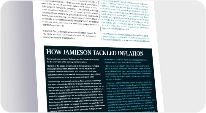 the range of stakeholders and, if it is forced to cut costs, where it pour les conseils qui ont à gérer des crises mondiales majeures. En can cut costs with the least negative impact on the company.” A ce sens, ce fut une expérience très constructive », soutient M. Dey. few recent examples illustrate his point – some of the banks giving « Une autre chose que la plupart des conseils ont apprise du- mid-year pay increases to their lower-paid employees to help with rant la pandémie, poursuit-il, fut l’importance des relations avec rising living costs; and grocers such as Metro trying to blunt some les parties prenantes. » of the impact of rising food prices. La plupart des conseils, croit-il, n’ont pas été pris au dépour- Most boards, Dey says, were not caught off guard by the spike in vu par la montée de l’inflation et des taux d’intérêt. « Certains inflation and interest rates. “There were some boards probably that d’entre eux étaient sans doute en train de pousser un soupir de were in the process of breathing a sigh of relief, having success- soulagement après avoir traversé la pandémie sans trop d’en- fully navigated through the pandemic. ... But the well-positioned combres. Mais un conseil bien positionné aurait compris qu’on board would have understood that we weren’t going to recreate n’allait pas pouvoir recréer après la pandémie le monde d’avant the prepandemic world in the post-pandemic world. Most boards, la pandémie. La plupart des conseils, je pense, ont pris le temps I think, were spending time thinking about what’s the world going de réfléchir à ce à quoi le monde allait ressembler une fois que to look like once we are successfully managing Covid? Where do we nous aurions géré la Covid avec succès. Où allons-nous nous fit into that world, and can we continue to be a sustainable business situer dans ce monde et pouvons-nous continuer d’être une en- over the long-term?” DJ treprise durable à long terme? » DJ VIRGINIA GALT, a former business and education reporter for VIRGINIA GALT, ancienne journaliste du Globe and Mail spécial- The Globe and Mail, covers legal, education and management isée en économie et en éducation, couvre les questions juridiques, issues for a number of publications. d’éducation et de gestion pour un certain nombre de publications. HOW JAMIESON TACKLED INFLATION The secret, says Jamieson Wellness chair Tim Penner, is managing Le président du conseil Tim Penner sur la stratégie de Jamieson for the short term while planning for the long term. Wellness : gérer le court terme, planifier le long terme. “Several of the people on our board do have experience managing « Bien des gens qui siègent à notre conseil ont une expérience de during inflationary times, based on the various industries and gestion en période inflationniste, selon les divers pays et industries countries where we have worked. This allowed us to ask good où ils ont travaillé. Cela nous a permis de poser des bonnes questions questions when we could see inflationary pressures rising and gave quand nous avons pris note des premières pressions inflationnistes. us great confidence in the plans management put in place. Nous en avons tiré une plus grande confiance dans les plans mis en “Several things have worked well for us. Primary among those things place par la direction. » is a sense of trust in the CEO, the CFO [chief financial officer] and the « Les choses ont bien fonctionné. D’abord, la confiance dans le chef management team. We knew they were facing challenging times, but we de la direction, le chef de la direction financière et l’équipe de cadres. also knew they were highly capable of dealing with those challenges. In Nous savions qu’ils traversaient des moments difficiles, mais nous addition, the board moved quickly on capital allocation decisions that savions aussi qu’ils étaient capables de relever les défis. Le conseil needed to be made through the heart of the crisis: temporarily holding a aussi agi rapidement pour prendre des décisions sur l’allocation more raw material inventory to manage supply chain volatility and lead- de capital qui devaient être rendues au cœur d’une crise. Nous time changes. We approved consulting fees and major capital projects avons approuvé des frais de consultation et des projets majeurs that would vastly expand our capacity to facilitate our growth for years d’investissement qui allaient élargir notre capacité de croissance dans to come. We invested in systems and process improvements to improve les années qui viennent. Nous avons investi dans nos systèmes et customer service. We worked on and approved a strategic plan that processus afin d’améliorer notre service à la clientèle. Nous avons plotted our growth plans for the future . . . approuvé un plan stratégique qui trace les voies de notre croissance. » “We evaluated M&A opportunities, resulting in the transformational « Nous avons évalué les opportunités de fusion et acquisition, ce qui acquisition of [Nutrawise Health & Beauty Corp.] and our entry into a permis notre entrée sur le marché américain – le plus important the U.S. market – the largest market for vitamins, minerals and marché du monde pour les vitamines, minéraux et suppléments. En supplements in the world. By staying in our own lane [as a board], we nous en tenant à nos prérogatives, nous avons été plus en mesure de could be of greater help to the long-term health of the business than soutenir la santé à long terme de l’entreprise que si nous nous étions by meddling in management’s lane.” mêlés des affaires de la direction. » - VG - VG