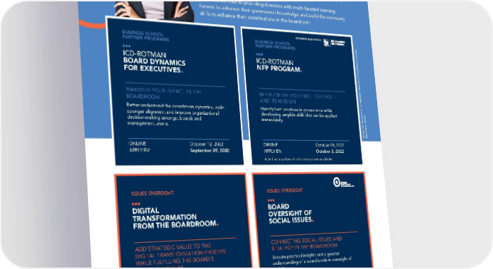Explore these upcoming ICD courses. ICD is committed to providing directors with multi-faceted learning forums to advance their governance knowledge and build the necessary skills to enhance their contributions in the boardroom. Scholarship supported by: Developed with: BUSINESS SCHOOL BUSINESS SCHOOL PARTNER PROGRAMS PARTNER PROGRAMS BOARD FUNDAMENTALS BOARD FUNDAMENTALS ICD-ROTMAN ICD-ROTMAN AUDIT ENTERPRISE BOARD DYNAMICS NFP PROGRAM. COMMITTEE RISK OVERSIGHT FOR EXECUTIVES. EFFECTIVENESS. FOR DIRECTORS. ed trademark of Royal Bank of Canada. MAXIMIZE YOUR IMPACT IN THE BETTER SERVE YOUR NOT-FOR-PROFIT BEYOND THE TRADITIONAL ROLE OF NAVIGATING THE MODERN BOARDROOM AND ITS MISSION egister COMPLIANCE OVERSIGHT RISK LANDSCAPE Better understand the boardroom dynamics, build Identify best practices in governance while Learn about the intricacies of key relationships, Acquire a deeper understanding of the board’s stronger alignment and improve organizational developing tangible skills that can be applied emergingissues and the committee’s role in role and how to participate in the risk oversight decision making amongst boards and immediately. enterprise risk. process constructively. management teams. ® [The RBC Foundation] is a rUsed under license. ONLINE October 12, 2022 ONLINE October 28, 2022 ONLINE October 18, 2022 ONLINE November 22, 2022 APPLY BY: September 29, 2022 APPLY BY: October 3, 2022 APPLY BY: September 27,2022 APPLY BY: November 1, 2022 A limited number of scholarships are available. Sponsored by: ISSUES OVERSIGHT ISSUES OVERSIGHT BOARD FUNDAMENTALS DIRECTOR EFFECTIVENESS DIGITAL BOARD HUMAN RESOURCE & CHAIRING TRANSFORMATION OVERSIGHT OF COMPENSATION COMMITTEE BOARDS. FROM THE BOARDROOM. SOCIAL ISSUES. EFFECTIVENESS. ADD STRATEGIC VALUE TO THE CONNECTING SOCIAL ISSUES AND OPTIMIZE THE BOARD’S UNDERSTANDING STRATEGIES FOR LEADING HIGHLY DIGITAL TRANSFORMATION PROCESS STRATEGY IN THE BOARDROOM OF HUMAN CAPITAL OVERSIGHT EFFECTIVE BOARDS WHILE FULFILLING THE BOARD’S Acquire practical insights and a greater Understand the considerations of talent Learn how to use forward-thinking strategies OVERSIGHT DUTIES understanding of a board’s role in oversight of management, CEO, succession planning and to engage and empower your board members Understand the board’s role in establishing the social issues. executive compensation, as well as increased scrutiny to achieve higher levels of performance and digital transformation vision, ambition and roadmap. of these issues by stakeholders. contribution. ONLINE November 23, 2022 ONLINE November 17, 2022 ONLINE October 19, 2022 ONLINE November 17, 2022 APPLY BY: November 2, 2022 APPLY BY: October 27, 2022 APPLY BY: September 28,2022 APPLY BY: October 27, 2022 FOR THE FULL RANGE OF COURSES INCLUDING THE ICD-ROTMAN DIRECTORS EDUCATION PROGRAM, VISIT ICD.CA/CALENDAR NOT SURE WHICH COURSE IS THE RIGHT FIT FOR YOU? CALL 416.593.3349 FOR A PERSONAL CONSULTATION.