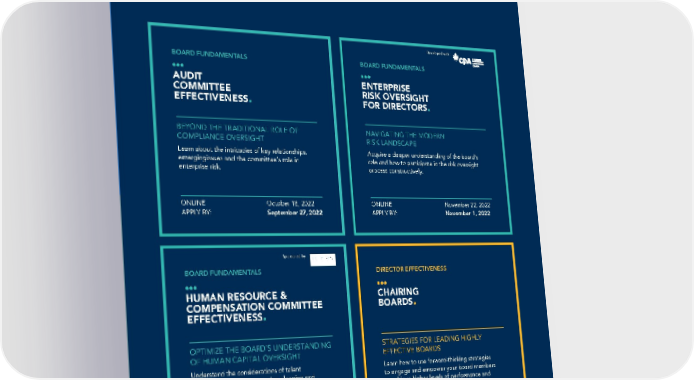 Explore these upcoming ICD courses. ICD is committed to providing directors with multi-faceted learning forums to advance their governance knowledge and build the necessary skills to enhance their contributions in the boardroom. Scholarship supported by: Developed with: BUSINESS SCHOOL BUSINESS SCHOOL PARTNER PROGRAMSPARTNER PROGRAMSBOARD FUNDAMENTALS BOARD FUNDAMENTALS ICD-ROTMANICD-ROTMANAUDIT ENTERPRISE BOARD DYNAMICS NFP PROGRAM.COMMITTEE RISK OVERSIGHT FOR EXECUTIVES. EFFECTIVENESS. FOR DIRECTORS. ed trademark of Royal Bank of Canada. MAXIMIZE YOUR IMPACT IN THE BETTER SERVE YOUR NOT-FOR-PROFIT BEYOND THE TRADITIONAL ROLE OF NAVIGATING THE MODERN BOARDROOMAND ITS MISSIONegisterCOMPLIANCE OVERSIGHT RISK LANDSCAPE Better understand the boardroom dynamics, build Identify best practices in governance while Learn about the intricacies of key relationships, Acquire a deeper understanding of the board’s stronger alignment and improve organizational developing tangible skills that can be applied emergingissues and the committee’s role in role and how to participate in the risk oversight decision making amongst boards and immediately.enterprise risk. process constructively. management teams. ® [The RBC Foundation] is a rUsed under license. ONLINEOctober 12, 2022ONLINEOctober 28, 2022ONLINE October 18, 2022 ONLINE November 22, 2022 APPLY BY: September 29, 2022APPLY BY: October 3, 2022APPLY BY: September 27, 2022APPLY BY: November 1, 2022 A limited number of scholarships are available. Sponsored by: ISSUES OVERSIGHTISSUES OVERSIGHTBOARD FUNDAMENTALS DIRECTOR EFFECTIVENESS DIGITAL BOARD HUMAN RESOURCE & CHAIRING TRANSFORMATION OVERSIGHT OF COMPENSATION COMMITTEE BOARDS. FROM THE BOARDROOM.SOCIAL ISSUES.EFFECTIVENESS. ADD STRATEGIC VALUE TO THE CONNECTING SOCIAL ISSUES AND OPTIMIZE THE BOARD’S UNDERSTANDING STRATEGIES FOR LEADING HIGHLY DIGITAL TRANSFORMATION PROCESS STRATEGY IN THE BOARDROOMOF HUMAN CAPITAL OVERSIGHT EFFECTIVE BOARDS WHILE FULFILLING THE BOARD’S Acquire practical insights and a greater Understand the considerations of talent Learn how to use forward-thinking strategies OVERSIGHT DUTIESunderstanding of a board’s role in oversight of management, CEO, succession planning and to engage and empower your board members Understand the board’s role in establishing the social issues. executive compensation, as well as increased scrutiny to achieve higher levels of performance and digital transformation vision, ambition and roadmap.of these issues by stakeholders.contribution. ONLINENovember 23, 2022ONLINENovember 17, 2022ONLINE October 19, 2022 ONLINE November 17, 2022 APPLY BY: November 2, 2022APPLY BY: October 27, 2022APPLY BY: September 28, 2022APPLY BY: October 27, 2022 FOR THE FULL RANGE OF COURSES INCLUDING THE ICD-ROTMAN DIRECTORS EDUCATION PROGRAM, VISIT ICD.CA/CALENDAR NOT SURE WHICH COURSE IS THE RIGHT FIT FOR YOU? CALL 416.593.3349 FOR A PERSONAL CONSULTATION.