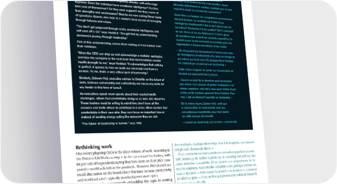 The right CEO for the times In this era of exponential change, the definition of strong leadership En cette ère de changements exponentiels, la has shifted. What makes the best candidate for the top job today? définition d’un leadership fort s’est modifiée. Quels According to Mary Jo Haddad, a corporate director, soft skills reign éléments déterminent le meilleur candidat pour le plus supreme. Does the individual have emotional intelligence? Do they important poste de commande aujourd’hui? take care of themselves? Do they seek support? Are they aware of Selon Mary Jo Haddad, les compétences personnelles their strengths and weaknesses? Boards are now asking these types doivent dominer. Le candidat est-il doté d’une of questions. Boards also look at a leader’s track record of managing intelligence émotionnelle? Est-ce qu’il prend soin de through failures and crises. lui-même? Recherche-t-il du soutien? Est-il conscient “You don’t get judgment through crisis, emotional intelligence and de ses forces et de ses faiblesses? C’est le genre self-care off a CV,” says Haddad. “You get that by understanding de questions que posent les conseils aujourd’hui. Ils someone’s journey through leadership.” veulent aussi savoir comment un candidat gère une organisation à travers les échecs et les crises. Part of this understanding comes from looking at how leaders own their mistakes. « On n’acquiert pas du jugement à travers une crise, de l’intelligence émotionnelle et la prise en charge de “When the CEO can step up and acknowledge a mistake, apologize, soi-même sur la foi d’un CV, souligne Mme Haddad. and take the company to the next level, that demonstrates mental On l’obtient par un parcours en leadership. » health strength to me,” says Haddad. “It acknowledges that nothing is perfect. It speaks to how we build our character and trust as Cette vision s’appuie en partie sur l’observation de leaders. To me, that’s a very critical part of leadership.” leaders qui assument leurs erreurs. Similarly, Zabeen Hirji, executive advisor to Deloitte on the future of « Quand un chef de la direction peut reconnaître work, believes vulnerability and authenticity are necessary skills for une erreur, s’en excuser et porter l’entreprise à un any leader in this time of tumult. niveau supérieur, cela est à mes yeux l’indice d’une As executives speak more openly about their mental health solide santé mentale, poursuit Mme Haddad. Pour challenges, others feel comfortable doing so as well, she observes. moi, c’est un élément essentiel du leadership. » These leaders must be willing to admit they don’t have all the De la même façon, Zabeen Hirji croit que answers and invite others to contribute in a crisis. When leaders feel la vulnérabilité et l’authenticité sont des comfortable in their own skin, they can focus on important issues compétences essentielles pour tout leader instead of wasting energy acting like someone they are not. en cette époque de tumulte. “The future of leadership is human,” says Hirji. « L’avenir du leadership est humain », conclut-elle. Rethinking work des employés, explique Mme Hirji. Une fois intégrées, ces mesures One worry plaguing CEOs is the sheer volume of work. According to ont plus de chances de durer. » the Deloitte/LifeWorks survey, it is the top stressor for leaders, with Tout comme les examens médicaux annuels auxquels se soumet- 68 per cent of respondents saying they have more on their plate com- tent beaucoup de cadres supérieurs, le coaching exécutif est une pared to workloads before the pandemic. However, Hirji doesn’t see autre initiative susceptible d’être ajoutée aux programmes de bi- much discussion on the board about this issue because productivity en-être existants. Kara Hardin considère cette pratique comme un and workload aren’t typically standard governance topics. espace destiné à « faire baisser la gravité et la pression », comme si Once again, she recommends embedding the topic in existing on allait au gym. « C’est un lieu qui permet aux cadres de laisser là projects. For example, directors can ask about the impact on people leurs soucis », dit-elle. and productivity when approving a large technology rollout. Is tech- Repenser le travail nology deployed to help executives simplify tasks and liberate time? With the preponderance of virtual meetings, can meeting culture be Le seul volume de travail est un souci considérable pour les chefs revisited to allow for more frequent optional attendance? Are new de la direction. Selon le sondage Deloitte/LifeWorks, il s’agit work models inclusive, and do they offer the right tools and support? du principal élément de stress pour les dirigeants, alors que 68 “It’s important to build rethinking work into decisions around pour cent des répondants affirment qu’ils ont plus de pain sur la where and when the work is done, as opposed to doing things the planche qu’avant la pandémie. same way, just in a different place,” says Hirji. Là encore, Mme Hirji recommande d’intégrer la question dans