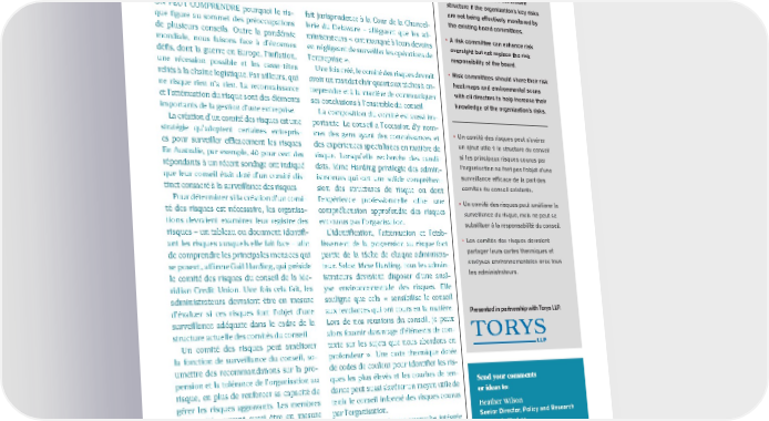 DIRECTORS’ DILEMMA DIRECTOR LENS • A risk committee may be a helpful addition to the board’s committee structure if the organization’s key risks are not being effectively monitored by ON PEUT COMPRENDRE pourquoi le ris- fait jurisprudence à la Cour de la Chancel- the existing board committees. que figure au sommet des préoccupations lerie du Delaware – allèguent que les ad- • A risk committee can enhance risk de plusieurs conseils. Outre la pandémie ministrateurs « ont manqué à leurs devoirs oversight but not replace the risk mondiale, nous faisons face à d’énormes en négligeant de surveiller les opérations de responsibility of the board. défis, dont la guerre en Europe, l’inflation, l’entreprise ». une récession possible et les casse-têtes Une fois créé, le comité des risques devrait • Risk committees should share their risk reliés à la chaîne logistique. Par ailleurs, qui avoir un mandat clair quant aux tâches à en- heat maps and environmental scans ne risque rien n’a rien. La reconnaissance treprendre et à la manière de communiquer with all directors to help increase their et l’atténuation du risque sont des éléments ses conclusions à l’ensemble du conseil. knowledge of the organization’s risks. importants de la gestion d’une entreprise. La composition du comité est aussi im- La création d’un comité des risques est une portante. Le conseil a l’occasion d’y nom- stratégie qu’adoptent certaines entrepris- mer des gens ayant des connaissances et • Un comité des risques peut s’avérer es pour surveiller efficacement les risques. des expériences spécialisées en matière de un ajout utile à la structure du conseil En Australie, par exemple, 40 pour cent des risque. Lorsqu’elle recherche des candi- si les principaux risques courus par répondants à un récent sondage ont indiqué dats, Mme Harding privilégie des admin- l’organisation ne font pas l’objet d’une que leur conseil était doté d’un comité dis- istrateurs qui ont une solide compréhen- surveillance efficace de la part des tinct consacré à la surveillance des risques. sion des structures de risque ou dont comités du conseil existants. Pour déterminer si la création d’un comi- l’expérience professionnelle offre une • Un comité des risques peut améliorer la té des risques est nécessaire, les organisa- compréhension approfondie des risques surveillance du risque, mais ne peut se tions devraient examiner leur registre des encourus par l’organisation. substituer à la responsabilité du conseil. risques – un tableau ou document identifi- L’identification, l’atténuation et l’étab- ant les risques auxquels elle fait face – afin lissement de la propension au risque font • Les comités des risques devraient de comprendre les principales menaces qui partie de la tâche de chaque administra- partager leurs cartes thermiques et se posent, affirme Gail Harding, qui préside teur. Selon Mme Harding, tous les admin- analyses environnementales avec tous le comité des risques du conseil de la Me- istrateurs devraient disposer d’une anal- les administrateurs. ridian Credit Union. Une fois cela fait, les yse environnementale des risques. Elle administrateurs devraient être en mesure souligne que cela « sensibilise le conseil d’évaluer si ces risques font l’objet d’une aux tendances qui ont cours en la matière. Presented in partnership with Torys LLP. surveillance adéquate dans le cadre de la Lors de nos réunions du conseil, je peux structure actuelle des comités du conseil. alors fournir davantage d’éléments de con- Un comité des risques peut améliorer texte sur les sujets que nous abordons en la fonction de surveillance du conseil, so- profondeur ». Une carte thermique dotée umettre des recommandations sur la pro- de codes de couleur pour identifier les ris- pension et la tolérance de l’organisation au ques les plus élevés et les courbes de ten- Send your comments risque, en plus de renforcer sa capacité de dance peut aussi s’avérer un moyen utile de or ideas to: gérer les risques aggravants. Les membres tenir le conseil informé des risques courus du comité peuvent aussi être en mesure par l’organisation. Heather Wilson d’approfondir les questions et d’acquérir Il faut maintenir une approche intégrée Senior Director, Policy and Research ainsi une compréhension plus complète du risque, peu importe la structure de [email protected] de la complexité de l’environnement de surveillance. Un comité des risques peut Every issue, we will feature a l’organisation en matière de risque. Une s’avérer un ajout utile si les risques pesant question from readers or one surveillance inadéquate de la part du con- sur l’organisation ne sont pas bien sur- from ICD’s complimentary seil peut être une source de litiges, sout- veillés par les comités existants. Peu im- research service, ICD BoardInfo ient Andrew Gray, associé chez Torys LLP porte la structure qui y préside, la surveil- à Toronto. Aux États-Unis, par exemple, les lance du risque est sous la responsabilité de icd.ca/boardinfo plaintes de Caremark – nom d’un cas qui a l’ensemble du conseil. DJ