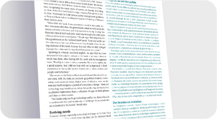 that it’s a kind of public service being a bank, because you have a licence étaient les bonnes et que notre système bancaire était bien moins à to operate that business, and the government can decide to take back risque que celui des États-Unis. » this licence. … You must remember, when you are on a bank board or Pourtant, la question de l’intérêt public s’insinue rapidement dans bank management, you operate under a licence of a public authority.” son esprit. « N’oublions pas que la banque est un service public. » Public service wisdom La sagesse du service public It’s that intersection between private business and public interest C’est à ce carrefour entre l’entreprise privée et l’intérêt public que la where Houde’s career differs from many board chairs. Houde has carrière de M. Houde diffère de celle de beaucoup de présidents du been inducted as a 2022 Fellow of the Institute of Corporate Direc- conseil. Celui-ci a été nommé Fellow 2022 de l’Institut des admin- tors, recognizing his many years of service on boards, including istrateurs de sociétés, en reconnaissance de ses nombreuses années as chair of the Montreal-based energy company Énergir from 2011 de service au sein de conseils d’administration, dont la présidence to 2020. Previously, he held various senior management positions du conseil d’Énergir de 2011 à 2020. Auparavant, il avait occupé at National Bank before working for Quebec’s Ministry of Finance divers postes de gestion à la Banque Nationale avant d’œuvrer au from 2005 to 2009. ministère des Finances du Québec de 2005 à 2009. “When I left the bank, I was appointed to work in the public ser- « Quand j’ai quitté la banque, j’ai été nommé dans la fonction pub- vice. Two years after that, the government asked me to become the lique. Deux ans plus tard, le gouvernement m’a demandé de devenir deputy minister of finance, and that was unfortunately [during] the sous-ministre des Finances et c’était malheureusement pendant la financial crisis of 2007 and 2008. And I was in touch a lot with CEOs crise financière de 2007 et 2008. J’ai alors été en contact avec beau- of financial institutions in Quebec,” Houde says. This helped lead to coup de dirigeants d’institutions financières au Québec », explique his appointment on the National Bank board. “That was maybe not M.Houde, ce qui l’a sans doute mené à sa nomination au conseil de the only reason, but one of the reasons they thought of me becom- la Banque Nationale. « Ce n’était peut-être pas la seule raison, mais ing chairman of the bank, because they saw what we did, trying to ces gens ont vu comment nous tentions de gérer la crise. ». manage that crisis and the way that I behaved in that crisis.” Il explique qu’il n’avait jamais rêvé de retourner dans le secteur Speaking in relaxed, accented English, he says that he never bancaire à titre d’administrateur, encore moins comme président dreamed he’d be asked to return to the bank to become a director, du conseil. « Franchement, j’ai été surpris. Mais ce fut une bonne much less chair, after having left the bank and its management surprise. J’ai fait de mon mieux avec l’expérience qui était la mi- team. “Frankly, it came to me as a surprise. Not a bad surprise, but enne. Je pense que mon passage dans la fonction publique m’a aidé a good surprise. But I did my best with my background. I think à mieux comprendre les gens et leurs comportements. » experience in the public service helped me to better understand Son mandat au conseil de la Banque Nationale a suivi la crise people and behaviour.” financière mondiale. Mais les risques n’en demeurent pas moins His tenure on the National Bank board followed the global finan- constants encore aujourd’hui : tensions géopolitiques, menaces à cial crisis. Still, the risks are constant: geopolitical tensions, wors- l’environnement, taux d’inflation en croissance, au moment même ening environmental news, higher rates of inflation, even as the où l’industrie elle-même traverse une période d’énormes change- industry itself navigates a period of tremendous change. Financial ments. La technologie financière est annonciatrice d’une époque technology may herald an era when the public may see banks less où les banques seront moins des institutions physiques qu’une col- as physical institutions than a collection of apps on their phones lection d’applications sur les téléphones et d’images sur les écrans. and blips on their screens. « Les banques sont aujourd’hui d’immenses appareils technologiques. “The banks today are huge technology outfits. You have to be able Il faut être en mesure de comprendre ça », soutient Jean Houde. to understand that, and be able also to challenge the proposals that are submitted to the board,” Houde says. Des besoins en évolution Le changement constant – surtout d’ordre technologique – est la Evolving needs première chose que souligne M. Houde quand il évoque son man- Constant change, especially technological change, is the first thing dat. Cette situation a amené au conseil de nouveaux administra- Houde notes when asked about his time on the National Bank teurs dotés d’expertise dans les technologies rapidement en émer- board. It has meant bringing in new directors with expertise in gence et d’une connaissance directe des habitudes changeantes des fast-emerging technologies and direct knowledge of changing cus- clients. Cela a aussi entraîné la nomination de certains adminis- tomer habits. This has entailed appointing some directors from out- trateurs choisis hors des communautés d’affaires de Montréal et de side the Montreal and Quebec business communities. Although the Québec. Comme il l’explique, le conseil offre aujourd’hui une plus board tries to maintain a majority of members from Quebec, Houde grande diversit