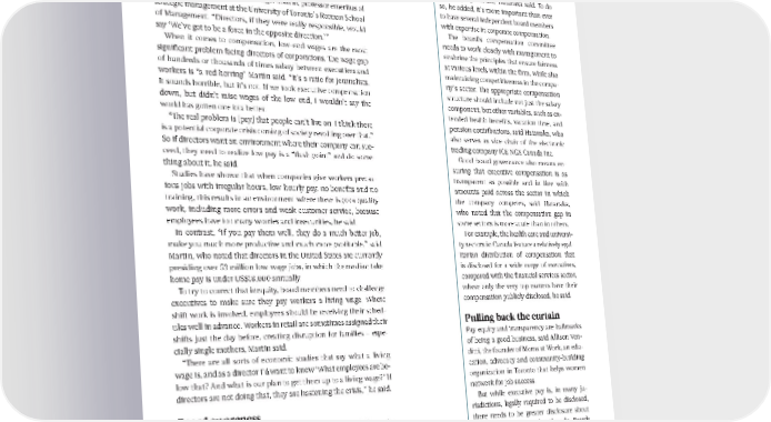 Low pay, high risk should be transparent about executive and Early in the pandemic, there was a sudden and widespread reali- employee pay, and connect bonuses to the zation that grocery workers stocking shelves were, in fact, essential organization’s success at meeting various workers. But it also became clear that many were paid at such a low ESG and sustainability-related targets that rate, they weren’t earning enough to cover their rent and basic costs. the company has set, Hatanaka said. To do When people are not paid a living wage, corporations are “headed so, he added, it’s more important than ever straight for a huge chasm,” said Roger Martin, professor emeritus of to have several independent board members strategic management at the University of Toronto’s Rotman School with expertise in corporate compensation. of Management. “Directors, if they were really responsible, would The board’s compensation committee say ‘We’ve got to be a force in the opposite direction.’” needs to work closely with management to When it comes to compensation, low-end wages are the most enshrine the principles that ensure fairness significant problem facing directors of corporations. The wage gap at various levels within the firm, while also of hundreds or thousands of times salary between executives and maintaining competitiveness in the compa- workers is “a red herring” Martin said. “It’s a ratio for journalists. ny’s sector. The appropriate compensation It sounds horrible, but it’s not. If we took executive compensation structure should include not just the salary down, but didn’t raise wages of the low end, I wouldn’t say the component, but other variables, such as ex- world has gotten one iota better. tended health benefits, vacation time, and “The real problem is [pay] that people can’t live on. I think there pension contributions, said Hatanaka, who is a potential corporate crisis coming of society revolting over that.” also serves as vice-chair of the electronic So if directors want an environment where their company can suc- trading company ICE NGX Canada Inc. ceed, they need to realize low pay is a “flash point” and do some- Good board governance also means en- thing about it, he said. suring that executive compensation is as Studies have shown that when companies give workers precar- transparent as possible and in line with ious jobs with irregular hours, low hourly pay, no benefits and no amounts paid across the sector in which training, this results in an environment where there is poor quality the company competes, said Hatanaka, work, including more errors and weak customer service, because who noted that the compensation gap in employees have too many worries and insecurities, he said. some sectors is more acute than in others. In contrast, “If you pay them well, they do a much better job, For example, the health care and universi- make you much more productive and much more profitable,” said ty sectors in Canada feature a relatively egal- Martin, who noted that directors in the United States are currently itarian distribution of compensation that presiding over 53 million low-wage jobs, in which the median take is disclosed for a wide range of executives, home pay is under US$18,000 annually. compared with the financial services sector, To try to correct that inequity, board members need to challenge where only the very top earners have their executives to make sure they pay workers a living wage. Where compensation publicly disclosed, he said. shift work is involved, employees should be receiving their sched- ules well in advance. Workers in retail are sometimes assigned their Pulling back the curtain shifts just the day before, creating disruption for families – espe- Pay equity and transparency are hallmarks cially single mothers, Martin said. of being a good business, said Allison Ven- “There are all sorts of economic studies that say what a living ditti, the founder of Moms at Work, an edu- wage is, and as a director I’d want to know ‘What employees are be- cation, advocacy and community-building low that? And what is our plan to get them up to a living wage?’ If organization in Toronto that helps women directors are not doing that, they are hastening the crisis,” he said. network for job success. But while executive pay is, in many ju- Board awareness risdictions, legally required to be disclosed, Demographics and technology are putting a bigger spotlight on the there needs to be greater disclosure about wage gap. Younger generations, for instance, have “seen the Inter- why executives make what they do. Boards net democratize information [and] flow through social media in need to set expectations on what they think a way that’s given them broader access to the environmental and is realistic and meaningful for executive com- social issues of the day,” said Bill Hatanaka, who serves as chair of pensation. For example, “People are taking Ontario Health, a provincial agency for co-ordinating health care. great issue with golden parachutes,” those “They want their firms to demonstrate a social conscience and to massive payouts top executives get when they follow through on that commitment in a meaningful way.” leave a company, said Venditti, who is also a For an organization to be considered socially responsible today, it career coach and human resources expert.