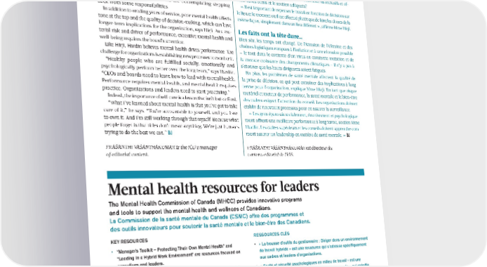 Heavy is the head … les projets existants. Par exemple, avant d’approuver l’implantation Times have certainly changed. From the invasion of Ukraine massive d’une nouvelle technologie, les administrateurs peuvent and fractured supply chains to inflation and a potential re- s’enquérir de son impact sur les gens et la productivité. La tech- cession – all against the backdrop of a mutating virus and the nologie aidera-t-elle les cadres à simplifier leurs tâches et à libérer growing threat of climate change – it’s no wonder CEOs are du temps? Les nouveaux modèles de travail sont-ils inclusifs et of- tired. Unsurprisingly, the Deloitte/LifeWorks study finds that frent-ils les outils et le soutien adéquats? more than half of senior leaders are contemplating stepping « Il est important de repenser le travail en fonction de décisions sur back from some responsibilities. le lieu et le moment où il est effectué plutôt que de faire les choses de la In addition to eroding years of service, poor mental health affects même façon, simplement dans un lieu différent », affirme Mme Hirji. tone at the top and the quality of decision-making, which can have longer-term implications for the organization, says Hirji. As a ma- Les faits ont la tête dure… terial risk and driver of performance, executive mental health and Bien sûr, les temps ont changé. De l’invasion de l’Ukraine et des well-being requires the board’s attention. chaînes logistiques rompues à l’inflation et à une récession possible Like Hirji, Hardin believes mental health drives performance. The – le tout dans le contexte d’un virus en constante mutation et de challenge for organizations is establishing new processes to monitor it. la menace croissante des changements climatiques – il n’y a pas à “Healthy people who are fulfilled socially, emotionally and s’étonner que les hauts dirigeants soient fatigués. psychologically perform better over the long term,” says Hardin. En plus, les problèmes de santé mentale affectent la qualité de “CEOs and boards need to learn how to lead with mental health. la prise de décision, ce qui peut entraîner des implications à long Performance requires mental health, and mental health requires terme pour l’organisation, explique Mme Hirji. En tant que risque practice. Organizations and leaders need to start practising.” matériel et moteur de performance, la santé mentale et le bien-être Indeed, the importance of self-care is a lesson that isn’t lost on Ford. des cadres exigent l’attention du conseil. Les organisations doivent “What I’ve learned about mental health is that you’ve got to take établir de nouveaux processus pour en assurer la surveillance. care of it,” he says. “You’re accountable to yourself, and you have « Les gens épanouis socialement, émotivement et psychologique- to own it. And I’m still working through that myself. Because what ment offrent une meilleure performance à long terme, soutien Mme people forget is that titles don’t mean anything. We’re just humans Hardin. Les cadres supérieurs et les conseils doivent apprendre com- trying to do the best we can.” DJ ment assurer un leadership en matière de santé mentale. » DJ PRASANTHI VASANTHAKUMAR is the ICD’s manager PRASANTHI VASANTHAKUMAR est directeur du of editorial content. contenu éditorial de l’IAS. Mental health resources for leaders The Mental Health Commission of Canada (MHCC) provides innovative programs and tools to support the mental health and wellness of Canadians. La Commission de la santé mentale du Canada (CSMC) offre des programmes et des outils innovateurs pour soutenir la santé mentale et le bien-être des Canadiens. KEY RESOURCES RESSOURCES CLÉS • “Manager’s Toolkit – Protecting Their Own Mental Health” and • « La trousse d’outils du gestionnaire : Diriger dans un environnement “Leading in a Hybrid Work Environment” are resources focused on de travail hybride » est une ressource qui s’adresse spécifiquement executives and leaders. aux cadres et leaders d’organisations. • “National Standard of Canada for Psychological Health and Safety • « Santé et sécurité psychologiques en milieu de travail » est une in the Workplace” is a set of voluntary guidelines, tools and norme volontaire – la première en son genre au monde – qui spécifie resources to guide organizations in fostering good mental health. les exigences d’une approche documentée et systématique pour This standard is the first of its kind in the world. maintenir un milieu de travail psychologiquement sain et sécuritaire. • “The Working Mind” is a training program that helps • « L’esprit au travail » est un programme de formation qui aide les organizations raise awareness and reduce the stigma around organisations à mieux prendre conscience des défis liés à la santé mental health challenges. mentale et à réduire les maux qui y sont associés. These resources and others can be found on the website Ces ressources et d’autres documents sont disponibles sur le site Web mentalhealthcommission.ca commissionsantementale.ca.