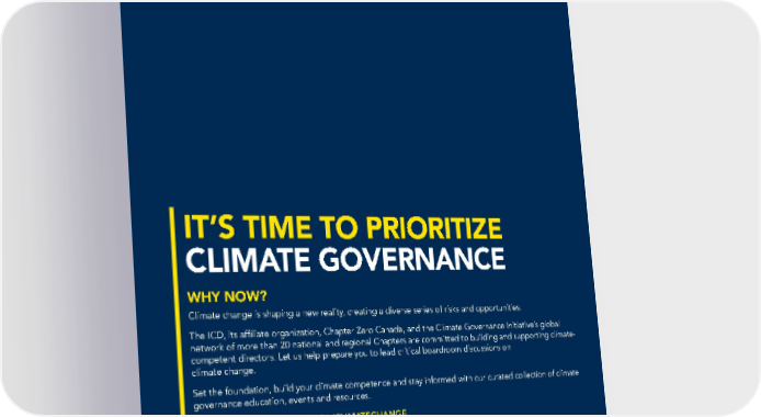 IT’S TIME TO PRIORITIZE CLIMATE GOVERNANCE WHY NOW? Climate change is shaping a new reality, creating a diverse series of risks and opportunities. The ICD, its affiliate organization, Chapter Zero Canada, and the Climate Governance Initiative’s global network of more than 20 national and regional Chapters are committed to building and supporting climate- competent directors. Let us help prepare you to lead critical boardroom discussions on climate change. Set the foundation, build your climate competence and stay informed with our curated collection of climate governance education, events and resources. TO LEARN MORE, VISIT ICD.CA/CLIMATECHANGE Canada