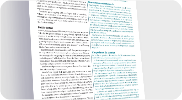 Stretched consumers atténuer l’impact pour ses clients. « Nous absorbons certains de ces Buzz Hargrove, former president of the Canadian Auto Workers coûts [d’approvisionnement] sans les refiler aux consommateurs, union and retired executive director of the Centre for Labour Man- dont les budgets sont serrés. Et nous travaillons très fort à créer de agement Relations at Ryerson University (now known as Toronto la valeur. Mais si cet environnement hautement inflationniste se Metropolitan University) says “smart employers” recognize that maintient, il exercera beaucoup de pression sur nos marges. » their employees’ standard of living has been eroded by inflation Des consommateurs serrés and are raising pay. “You’ve got to be on top of things to make sure you don’t lose your good people.” But, he predicts, Canada is head- Buzz Hargrove, ancien président des Travailleurs unis de l’auto- ed for a lot more labour disruption in the coming months, partic- mobile et directeur à la retraite du Centre for Labour Manage- ularly in the public sector organizations where governments are ment Relations de l’Université Ryerson (maintenant connue sous imposing wage caps. le nom d’Université métropolitaine de Toronto), explique que les Canadians are struggling with the higher cost of everything. « employeurs intelligents » reconnaissent que le niveau de vie “I have a good pension, it has inflation protection in it, but I am de leurs employés a été affaibli par l’inflation et ils augmentent shocked when I go to the butcher shop and see steaks for $22 or $23 leurs salaires en conséquence. « Vous devez prendre les choses en a pound,” Hargrove said. “I just shake my head and walk on by to main pour faire en sorte de ne pas perdre vos bons employés », the chicken counter.” dit-il. Mais il prédit que le Canada connaîtra néanmoins beaucoup de perturbations dans les prochains mois, en particulier chez les Battle-tested organisations du secteur public à qui les gouvernements imposent At Onex, founder, chair and CEO Gerry Schwartz offers some perspective: des plafonds salariaux. “Clearly, this global economy is going through a period of adjust- Les Canadiens font face à une hausse des prix qui affecte tous ment as it works its way through several macro-related issues. les produits et services. « J’ai un bon revenu de retraite, protégé While these transitions contribute to short-term market uncertain- contre l’inflation, poursuit M. Hargrove. Mais ça demeure un choc ty, nearly 40 years of cycle-tested experience has shown us it is pos- quand je me rends chez le boucher et que je vois des steaks à 22 sible to weather them and emerge even stronger,” he said during ou 23 $ la livre. Je secoue la tête et je me dirige vers le comptoir his firm’s second-quarter earnings call. du poulet. » In private equity, Onex is working with the operating companies L’expérience du combat in its portfolio on “value-creation plans and proactive and innova- tive strategies for mitigating the impacts of inflationary pressures Le fondateur, président du conseil et chef de la direction d’Onex, and rising rates,” added president Robert Le Blanc, whose firm at- Gerry Schwartz, offre une autre perspective. tracted more than 100 CEOs and chief financial officers to “a pro- « Il est clair que l’économie mondiale traverse une période d’ajust- ductivity and procurement council” in June. ement, alors qu’elle connaît de multiples problèmes globaux. Même The last word goes to veteran corporate director Peter Dey, a tire- si ce type de transition contribue à l’incertitude du marché à court less advocate of good governance. terme, près de 40 ans d’expérience à travers les cycles nous ont prou- Boards have upped their game, says Dey, an executive in resi- vé qu’il est possible d’y survivre et même d’en sortir plus fort. » dence at the University of Toronto’s Rotman School of Management En investissement privé, Onex travaille avec les entreprises de and chair of the board at Paradigm Capital Inc., a Toronto-based son portefeuille à des « plans de création de valeur et des stratégies independent investment dealer. He also serves on the board of Cal- proactives et innovantes afin d’atténuer les impacts des pressions gary-based Gran Tierra Energy Inc., which used higher oil profits to inflationnistes et des taux d’intérêt croissants », ajoute le président pay off its debt in the second quarter of 2022. “The mindset of that Robert Le Blanc, dont la firme a attiré plus de 100 chefs de la direc- board is long-term. We are grateful for the high energy prices that tion et chefs de la direction financière à un « conseil sur la produc- have enabled us to reconfigure our balance sheet,” says Dey. “But tivité et l’approvisionnement » tenu en juin. the issues like climate change are still forefront because we know Le dernier mot revient au vétéran administrateur Peter Dey, un in the long term those issues have to be managed.” infatigable promoteur de la bonne gouvernance, qui siège notam- The pandemic was a crash course in crisis management. “It’s one ment au conseil de Gran Tierra Energy, une entreprise de Calgary thing to manage internal crises within the operations of a business. qui a utilisé ses profits plus élevés du deuxième trimestre de 2022 . . . The pandemic was kind of an orientation process for boards to pour rembourser sa dette. deal with major global crises. In that respect, it proved to be very « L’idée de base de ce conseil est le long terme, explique-t-il. Nous constructive,” said Dey. sommes reconnaissants que les prix élevés de l’énergie nous aient “One of the other things I think most boards learned during the permis de reconfigurer notre bilan financier. Mais les enjeux comme course of the pandemic . . . was the importance of the relationship les changements climatiques d