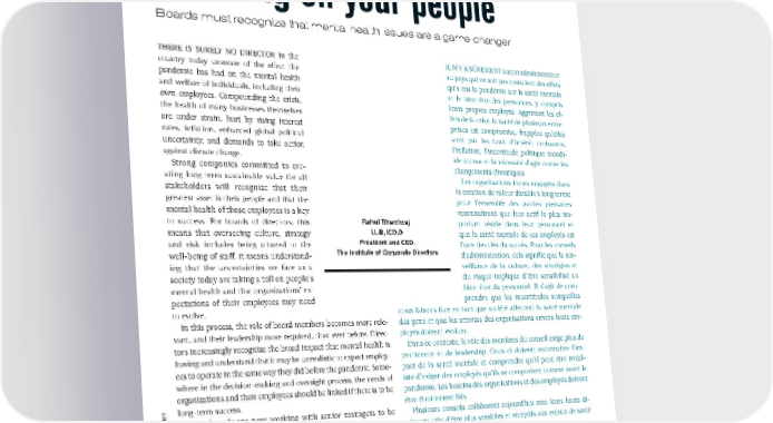 CEO INSIGHTS Focusing on your people Boards must recognize that mental health issues are a game-changer THERE IS SURELY NO DIRECTOR in the IL N’Y A SÛREMENT aucun administrateur country today unaware of the effect the au pays qui ne soit pas conscient des effets pandemic has had on the mental health qu’a eus la pandémie sur la santé mentale and welfare of individuals, including their et le bien-être des personnes, y compris own employees. Compounding the crisis, leurs propres employés. Aggravant les ef- the health of many businesses themselves fets de la crise, la santé de plusieurs entre- are under strain, hurt by rising interest prises est compromise, frappées qu’elles rates, inflation, enhanced global political sont par les taux d’intérêt croissants, uncertainty, and demands to take action l’inflation, l’incertitude politique mondi- against climate change. ale accrue et la nécessité d’agir contre les Strong companies committed to cre- changements climatiques. ating long-term sustainable value for all Les organisations fortes engagées dans stakeholders will recognize that their la création de valeur durable à long terme greatest asset is their people and that the pour l’ensemble des parties prenantes mental health of those employees is a key reconnaîtront que leur actif le plus im- to success. For boards of directors, this Rahul Bhardwaj portant réside dans leur personnel et means that overseeing culture, strategy LL.B, ICD.D que la santé mentale de ces employés est and risk includes being attuned to the President and CEO, l’une des clés du succès. Pour les conseils well-being of staff. It means understand- The Institute of Corporate Directors d’administration, cela signifie que la sur- ing that the uncertainties we face as a veillance de la culture, des stratégies et society today are taking a toll on people’s du risque implique d’être sensibilisé au mental health and that organizations’ ex- bien-être du personnel. Il s’agit de com- pectations of their employees may need prendre que les incertitudes auxquelles to evolve. nous faisons face en tant que société affectent la santé mentale In this process, the role of board members becomes more rele- des gens et que les attentes des organisations envers leurs em- vant, and their leadership more required, than ever before. Direc- ployés doivent évoluer. tors increasingly recognize the broad impact that mental health is Dans ce contexte, le rôle des membres du conseil exige plus de having and understand that it may be unrealistic to expect employ- pertinence et de leadership. Ceux-ci doivent reconnaître l’im- ees to operate in the same way they did before the pandemic. Some- pact de la santé mentale et comprendre qu’il peut être irréal- where in the decision-making and oversight process, the needs of iste d’exiger des employés qu’ils se comportent comme avant la organizations and their employees should be linked if there is to be pandémie. Les besoins des organisations et des employés doivent Y long-term success. être étroitement liés. Many boards are now working with senior managers to be Plusieurs conseils collaborent aujourd’hui avec leurs hauts di- more sensitive and responsive to mental health issues within rigeants afin d’être plus sensibles et réceptifs aux enjeux de santé MCCONOMtheir ranks. mentale dans leurs rangs. RON A director engaged and connected with the world and who ex- Un administrateur engagé faisant preuve d’expertise, de lead- A hibits expertise, leadership, wisdom and humanity, is one most ership, de sagesse et d’humanité est plus susceptible de porter A Y B likely to handle such difficult issues in the boardroom with cour- ces enjeux avec courage au conseil. J’exhorte tous nos membres à IONSage. I urge all members to continue your engagement on these and poursuivre leur engagement envers ces enjeux au sein de l’Institut T A other issues with the Institute of Corporate Directors – through our des administrateurs de société – dans nos sections régionales, notre R T local chapters, our community of directors, and through all of our communauté d’administrateurs et dans le cadre de toutes nos oc- US L L I learning opportunities. DJ casions d’apprentissage. DJ