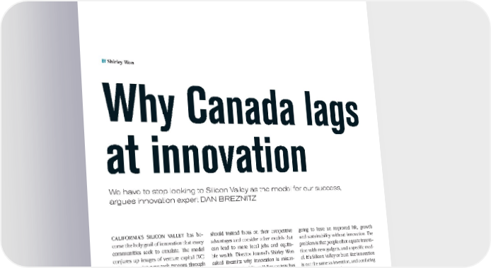 RECOMMENDED READING BY Shirley Won Why Canada lags at innovation We have to stop looking to Silicon Valley as the model for our success, argues innovation expert DAN BREZNITZ CALIFORNIA’S SILICON VALLEY has be- should instead focus on their competitive going to have an improved life, growth come the holy grail of innovation that many advantages and consider other models that and sustainability without innovation. The communities seek to emulate. The model can lead to more local jobs and equita- problem is that people often equate innova- conjures up images of venture capital (VC) ble wealth. Director Journal’s Shirley Won tion with new gadgets, and a specific mod- helping to mint new tech tycoons through asked Breznitz why innovation is misun- el. It’s Silicon Valley or bust. But innovation an eye-popping Nasdaq stock listing or a big derstood, why the Silicon Valley strategy has is not the same as invention, and conflating sale. But Dan Breznitz, chair of innovation problems, and how Canada can overcome its the two is wrong and dangerous. studies at the University of Toronto’s Munk poor innovation record. School of Global Affairs and co-director of Why is there confusion between its Innovation Policy Lab, warns of the fol- What was the motivation for writing innovation and invention? ly of trying to copy this high-tech vision for this book? Invention is coming up with new ideas. economic growth. In his book Innovation in It was out of frustration about the public Innovation is putting new ideas into reali- Real Places: Strategies for Prosperity in an discussion and debate about innovation. ty and across all production stages – from Unforgiving World, he argues that regions It’s an important issue because we are not first-to-the-world product and services, to