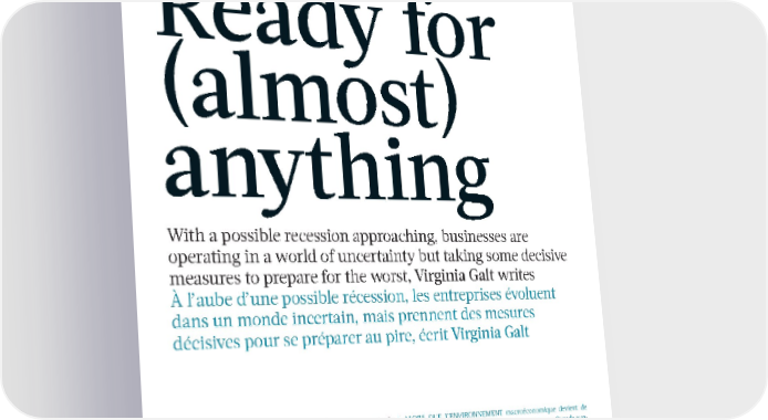 Ready for (almost) anything With a possible recession approaching, businesses are operating in a world of uncertainty but taking some decisive measures to prepare for the worst, Virginia Galt writes À l’aube d’une possible récession, les entreprises évoluent dans un monde incertain, mais prennent des mesures décisives pour se préparer au pire, écrit Virginia Galt AS THE MACROECONOMIC ENVIRONMENT becomes increasingly ALORS QUE L’ENVIRONNEMENT macroéconomique devient de perilous, Canadian boards of directors are stepping up their risk plus en plus périlleux, les conseils d’administration au Canada aug- oversight. They’re weighing the impact of persistent high inflation mentent leur surveillance du risque. Ils mesurent l’impact d’une in the context of other troubling trends: supply chain disruptions, inflation résolument élevée dans le contexte d’autres tendanc- labour scarcity, trade tensions, droughts and floods related to cli- es troublantes : perturbations de la chaîne logistique, pénurie de mate change, and the massive geopolitical upheaval caused by Rus- main-d’œuvre, tensions commerciales, sécheresses et inondations sia’s invasion of Ukraine. reliées aux changements climatiques et agitation géopolitique mas- It’s a daunting watch list. The workload of audit and risk com- sive causée par l’invasion de l’Ukraine par la Russie. mittees is such that some boards are now expanding their Voilà une liste de surveillance colossale. La tâche des comités com-