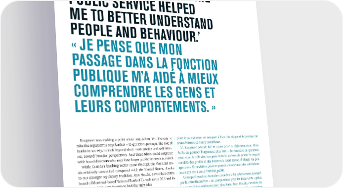 ‘I THINK EXPERIENCE IN THE PUBLIC SERVICE HELPED ME TO BETTER UNDERSTAND PEOPLE AND BEHAVIOUR.’ « JE PENSE QUE MON PASSAGE DANS LA FONCTION PUBLIQUE M’A AIDÉ À MIEUX COMPRENDRE LES GENS ET LEURS COMPORTEMENTS. » Krugman was making a point about regulation. Yet, it’s easy to pour le transformer en rempart à l’abri du risque et le protéger de take the argument a step further — to question, perhaps, the role of crises futures et non y contribuer. banks in society, to look beyond short-term profits and self-inter- M. Krugman prenait fait et cause pour la réglementation. Il est est, toward broader perspectives. And these ideas could originate facile de pousser l’argument plus loin – de remettre en question, with board directors who may have larger public interests in mind. peut-être, le rôle des banques dans la société, de porter le regard While Canada's banking sector came through the financial cri- au-delà des profits et des intérêts à court terme, d’élargir les per- sis relatively unscathed compared with the United States, thanks spectives. Et ces idées peuvent prendre forme avec des administra- to our stronger regulatory tradition, Jean Houde, a member of the teurs qui ont à cœur l’intérêt public. board of Montreal-based National Bank of Canada since 2011 and its Alors que le secteur bancaire canadien a été relativement épargné chair since 2014, says Krugman had the right idea. par la crise financière – en comparaison avec les États-Unis – grâce “For sure, we went through the financial crisis,” says Houde, who à une tradition réglementaire plus forte, Jean Houde, membre du served as Quebec’s deputy minister of finance at the time of the conseil de la Banque Nationale du Canada depuis 2011 et président upheaval. “We had our commercial paper [debt] crisis mostly in du conseil depuis 2014, affirme que M. Krugman avait raison. Quebec, but also elsewhere in Canada. But that demonstrates in my « Bien sûr, nous avons été touchés par la crise, admet M. Houde, view that the regulations done by OSFI [the Office of the Superin- qui à l’époque était sous-ministre des Finances du Québec. La tendent of Financial Institutions] and others, [including] the Bank crise du papier commercial a surtout affecté le Québec, mais aussi of Canada, were right, and we were a lot less risky as a system than d’autres régions du Canada. Mais selon moi, cela démontre que les the U.S. banks were.” réglementations édictées par le BSIF [Bureau du surintendant des And yet, public interest quickly enters his thinking. “Just keep in mind institutions financières] et d’autres – dont la Banque du Canada –