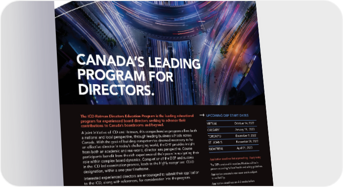 ICD-ROTMAN DIRECTORS EDUCATION PROGRAM. CANADA’S LEADING PROGRAM FOR DIRECTORS. The ICD-Rotman Directors Education Program is the leading educational UPCOMING DEP START DATES program for experienced board directors seeking to advance their contributions to Canada’s boardrooms and beyond. VIRTUAL October 14, 2022 A joint initiative of ICD and Rotman, this comprehensive program offers both CALGARY January 19, 2023 a national and local perspective, through leading business schools across TORONTO December 9, 2022 Canada. With the goal of building competencies deemed necessary to be an effective director in today’s challenging world, the DEP provides insight ST. JOHN’S November 28, 2022 from both an academic and real-world, director lens perspective. Course MONTREAL April 21, 2023 participants benefit from the rich experience of their peers in navigating their role within complex board dynamics. Completion of the DEP and success in the ICD led examination process, leads to the highly recognized ICD.D Application deadlines fast approaching - Apply today designation, within a one-year timeframe. The DEP consists of 4 modules. Modules will be in Interested experienced directors are encouraged to submit their application person according to local health and safety guidelines. to the ICD, along with references, for consideration into the program. Application process is now open and is subject to availability. APPLY ONLINE ICD.CA/DEP Application deadlines are 4-6 weeks before the class start date. For a personal consultation call 416.593.3325 or email [email protected]. Think beyond the boardroom.