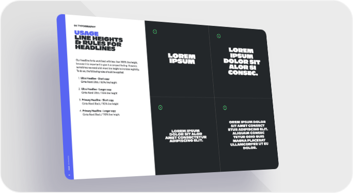 04 typography 1 2 Usage line heights Lorem & rules for headlines ipsum Lorem dolor sit ipsum Our headline fonts work best with less than 100% line height, alor si because it is important to give it a compact feeling. However, sometimes we need a bit more line height to increase legibility. consec. To do so, the following rules should be applied< 0H Ultra Headline - Short copy Ginto Nord Ultra / 80% line heighX $H Ultra Headline - Longer copy Ginto Nord Ultra / 95% line heighX "H Primary Headline - Short copy Ginto Nord Black / 90% line heighX 3 4 !H Primary Headline - Longer copy Ginto Nord Black / 110% line height OREM IPSUM DOLOR SIT AMET CONSECT ETUR ADIPISCING ELIT. Lorem ipsum dolor sit alor ALIQUAM CONSEC amet consectetur TETUR ODIO QUIS adipiscing elit. MAGNA PLACERAT ULLAMCORPER UT EU DOLOR. d or Disc 44
