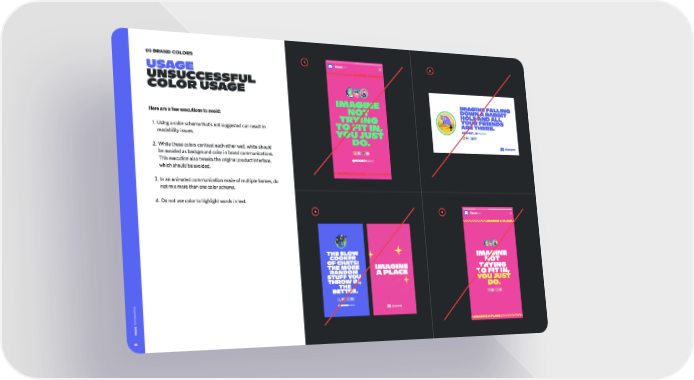 03 brand colors 1 2 USAGE UNSUCCESSFUL color usage imagine falling down a rabbit IImmaaggiinnee aa hole and all ppllaaccee wwhheerree Here are a few executions to avoid* your friends ffrriieennddsshhiipp iiss FPO nnoott aa rreeqquueesstt.. are there. IItt jjuusstt ssoorrttaa @FIDGET_M #0000 E? Using a color scheme that’s not suggested can result in hhaappppeennss.. 34 30 readability issues.2 4343 2323 ,? While these colors contrast each other well, white should 32 30 be avoided as background color in brand communications. @Gregz#2347 This execution also tweaks the original product interface, which should be avoided? $? In an animated communication made of multiple frames, do not mix more than one color scheme? #? Do not use color to highlight words in text. 3 4 The slow Imagine cooker not of chats: the more trying random to fit in, stuff you you just throw in, do. the better. 43 13 43 13 @Gregz#2347 d or Disc 38