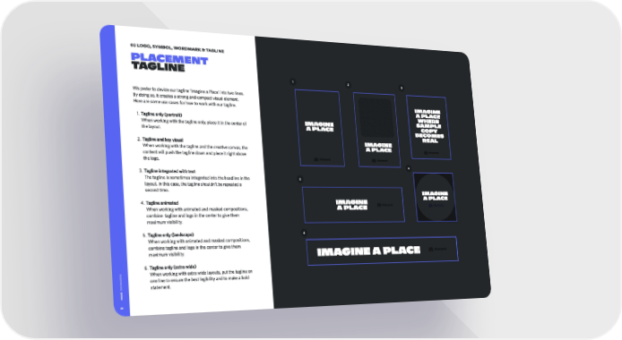 02 logo, symbol, wordmark & tagline Placement tagline 1 2 3 We prefer to devide our tagline ‘Imagine a Place’ into two lines. By doing so, it creates a strong and compact visual element. Imagine Here are some use cases for how to work with our tagline.A a Place where 6P Tagline only (portrait) sample Imagine When working with the tagline only, place it in the center of copy a Place the layoutP becomes real +P Tagline and key visual Imagine a Place When working with the tagline and the creative canvas, the content will push the tagline down and place it right above the logoP 4 ,P Tagline integrated with text 5 The tagline is sometimes integrated into the headline in the layout. In this case, the tagline shouldn’t be repeated a second timeP Imagine a Place %P Tagline animated Imagine a Place When working with animated and masked compositions, combine tagline and logo in the center to give them maximum visibilityP 6 XP Tagline only (landscape) When working with animated and masked compositions, combine tagline and logo in the center to give them maximum visibilityP Imagine a Place $P Tagline only (extra wide) When working with extra wide layouts, put the tagline on one line to ensure the best legibility and to make a bold statement. d or Disc 20