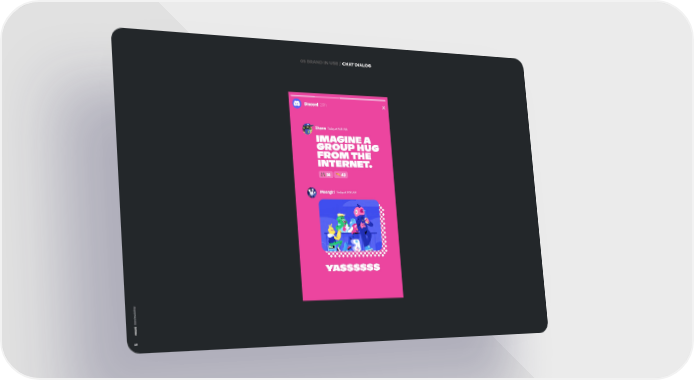 Discord Brand Book Page 63 Page 6510 BRAND IN USE 05 brand in use / chat DIALOG CHAT DIALOG EXECUTIONS Lorem ipsum Today at 9:18 AM Shawn Imagine a group hug from the internet. 56 43 Today at 9:18 AM Moongirl yassssss d or Disc 64